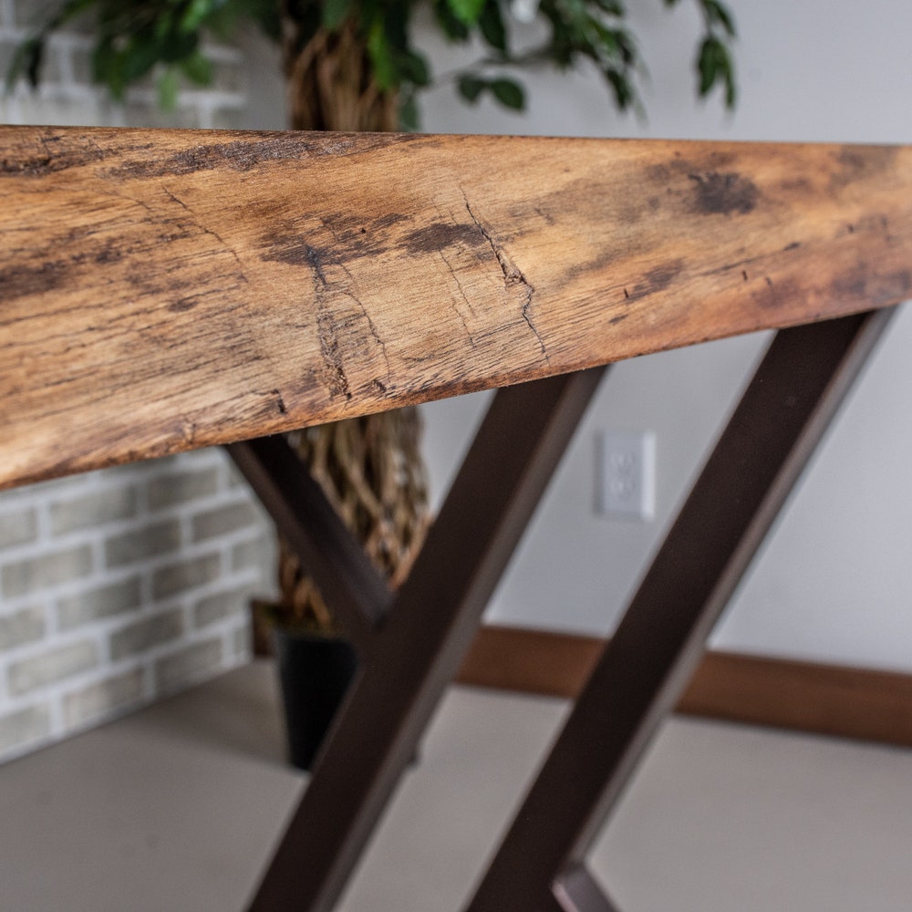 The burnt penny finish on these steel table legs adds a beautiful dimension to this table. It subtly pulls out the red leaning tones in the walnut. We build every table to order so there are many ways to make this table perfect for you.