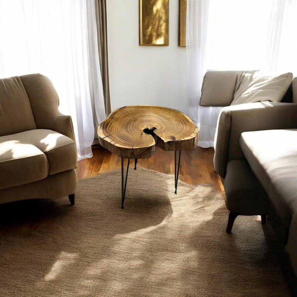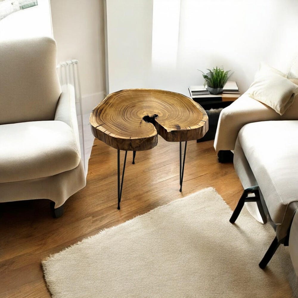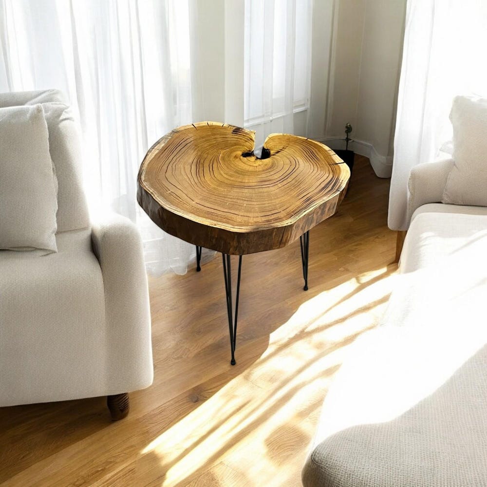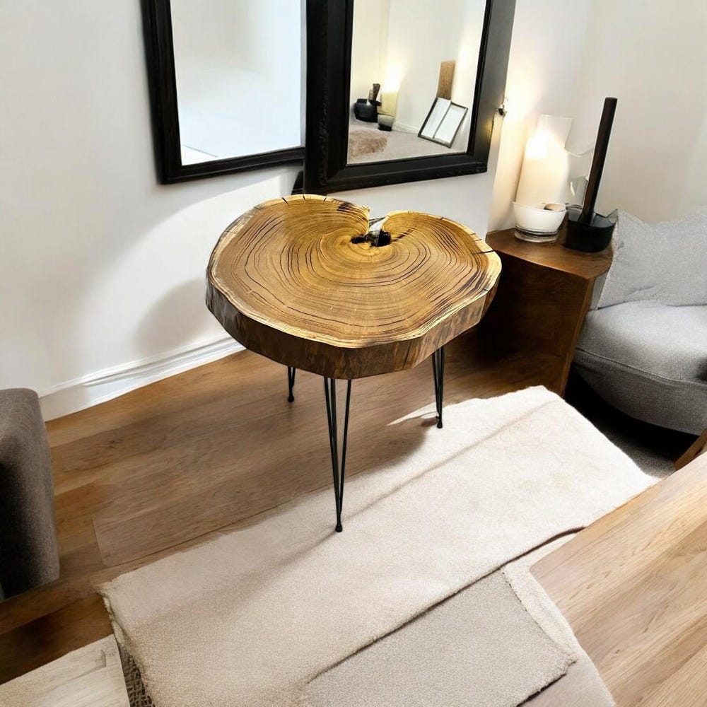 This natural tree slice table is elevated with sleek black hairpin legs, blending rustic charm with modern minimalism — perfect as a bedside nightstand, sofa side table, or a charming entryway accent piece.