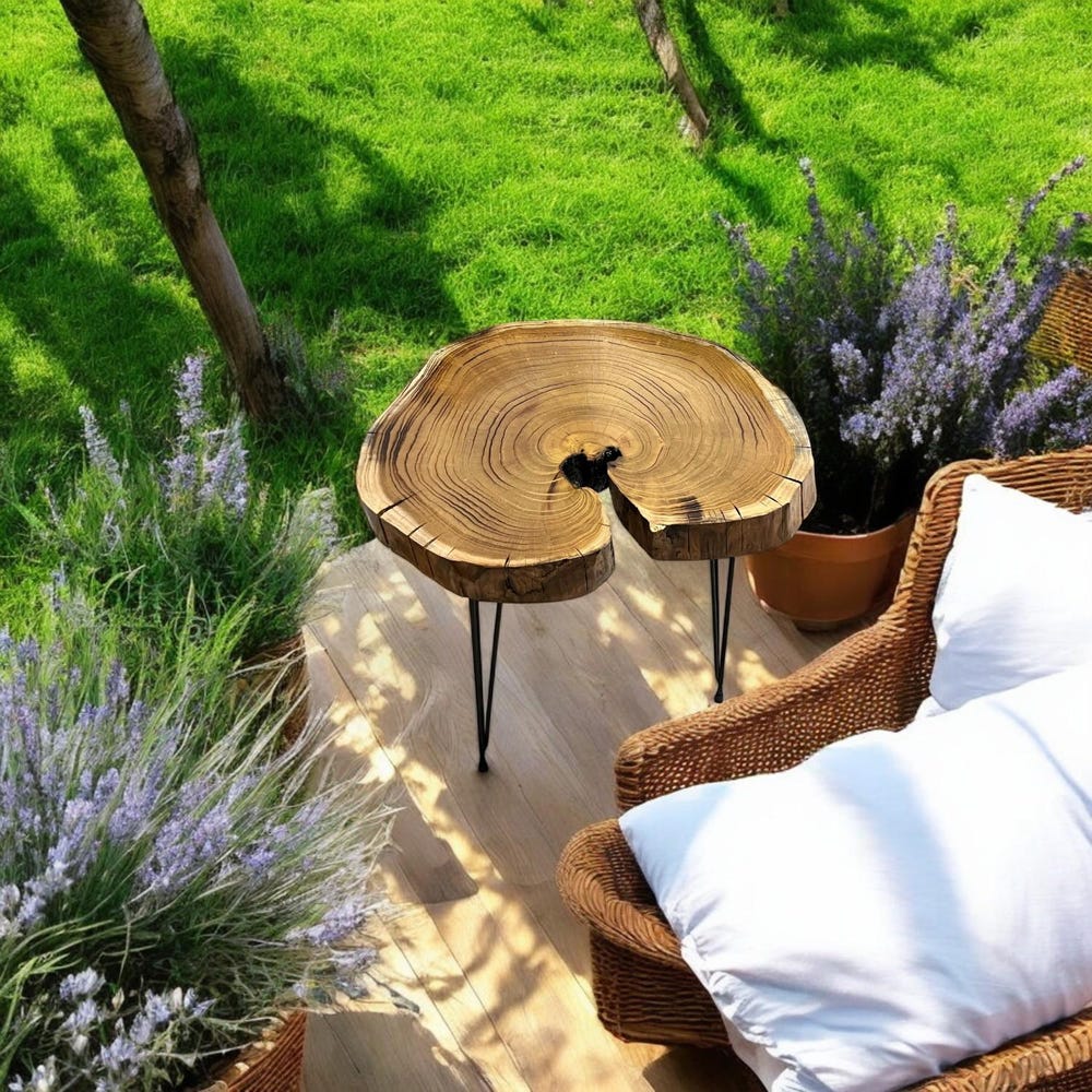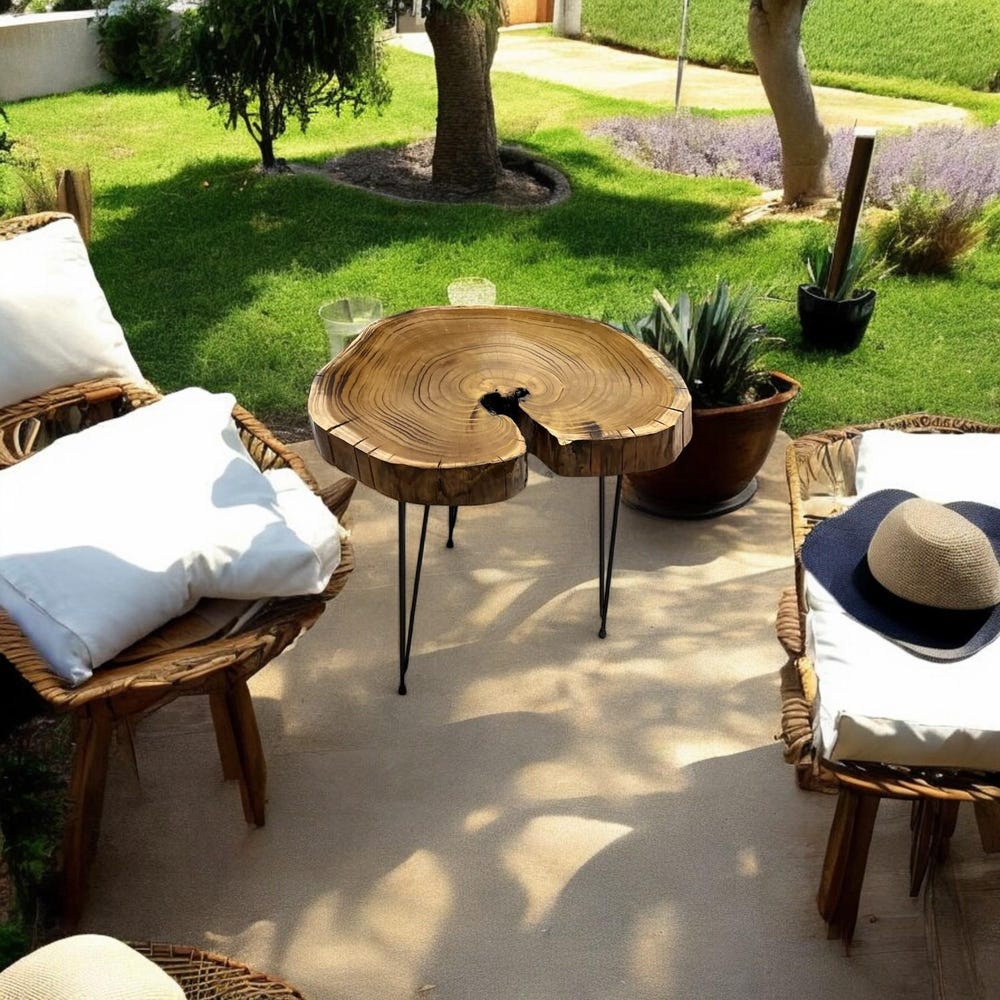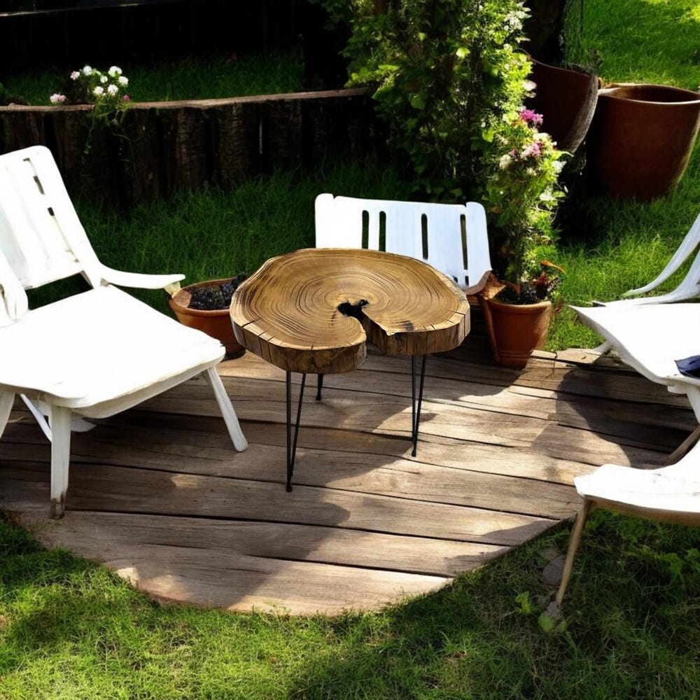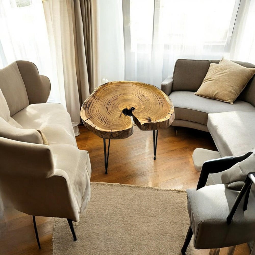 This natural tree slice table is elevated with sleek black hairpin legs, blending rustic charm with modern minimalism — perfect as a bedside nightstand, sofa side table, or a charming entryway accent piece.