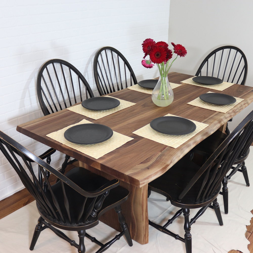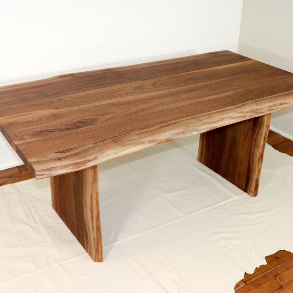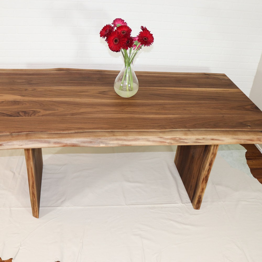 Live Edge Wooden Table with Walnut Panel Legs, Modern Walnut Dining Table, Live Edge Walnut Table, Solid Walnut Dining Table