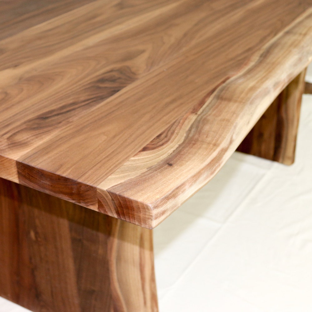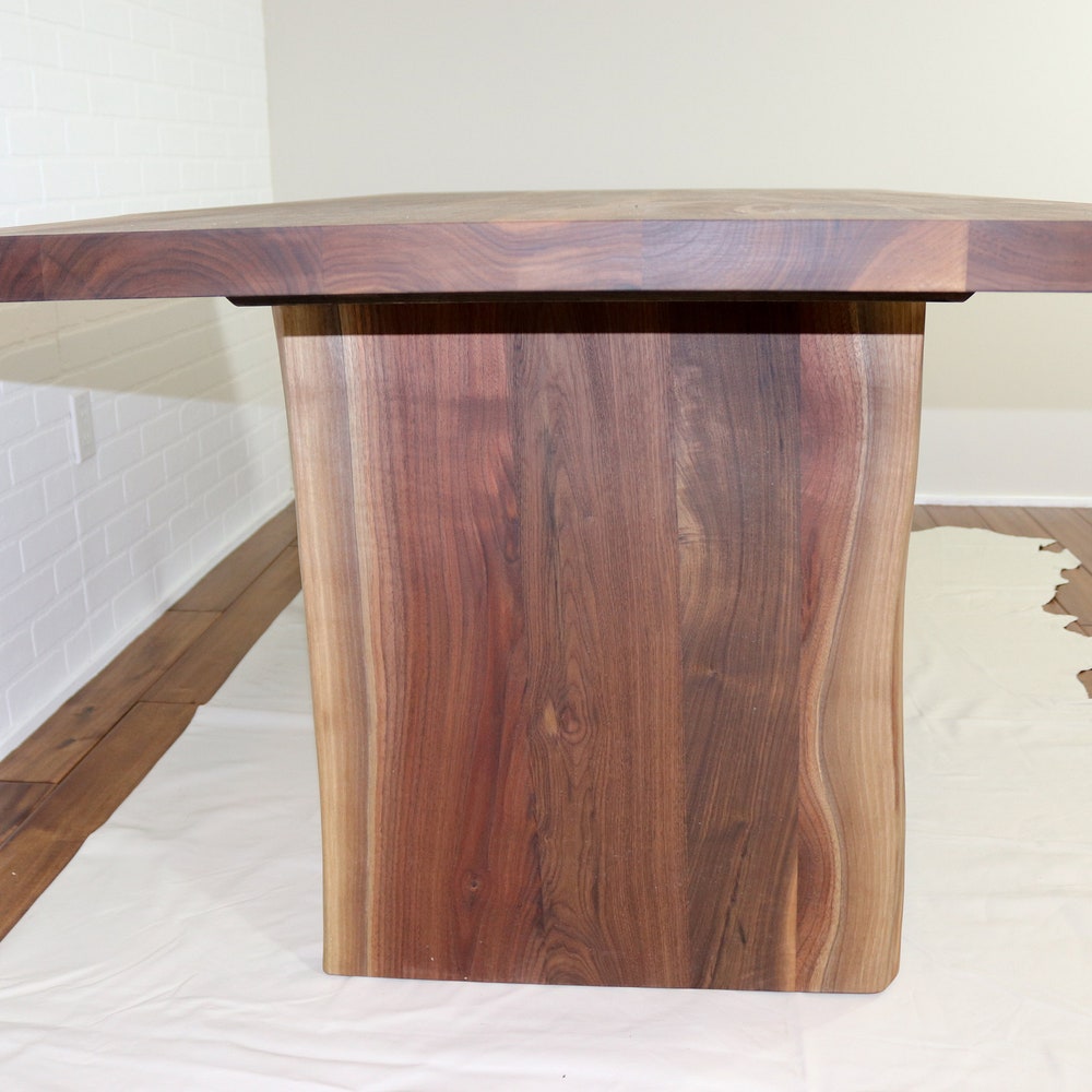 Celebrate the beauty of walnut with this live edge wooden table. A live edge walnut top paired with live edge walnut panel legs adds elegance to a space. This design is best suited to table 7′ long and longer to have enough space at the ends. We build every table to order so there are many ways to make this table perfect for you.