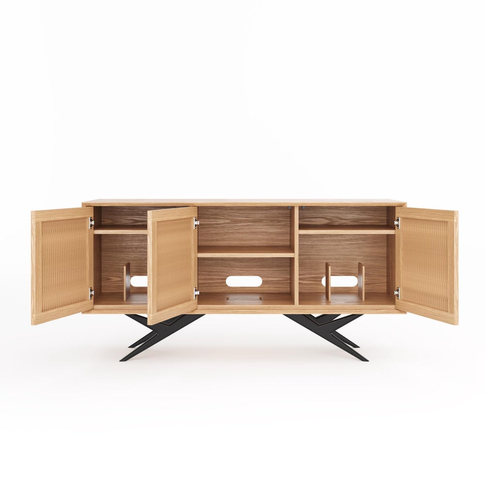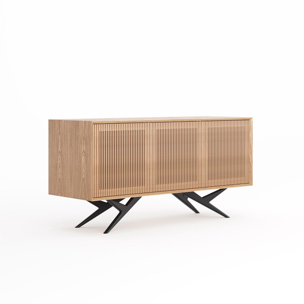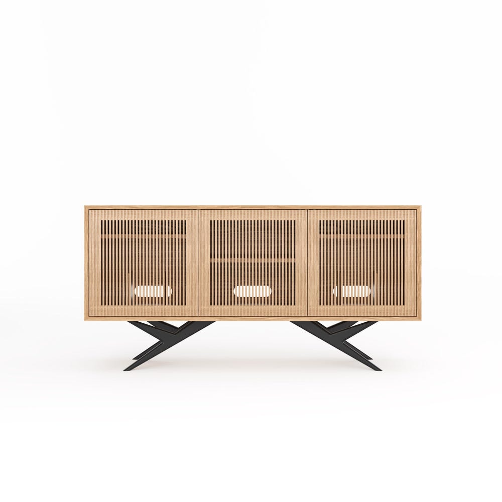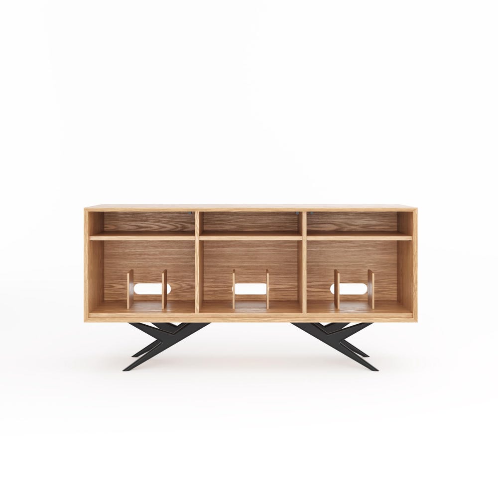Long oak record player stand with three slatted doors and black, aluminum, organic shape base in mid century modern style. The cabinet includes removable record dividers and adjustable shelves , allowing you to customize the storage space to accommodate media equipment and vinyl records. Cable holes in back + shelves with cutouts for wire management. Shelves are ideal for storing an amplifier and receiver.