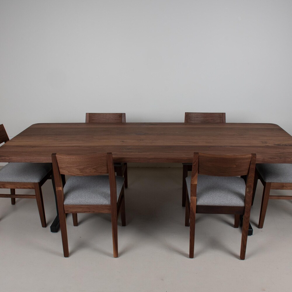 This long walnut dining table was built for a customer and is now in their home. We can build one like it for you that is tailored to your needs. We build every table out of solid hardwoods one at a time. Our design team is happy to help you figure out the details of the table that is best for you.