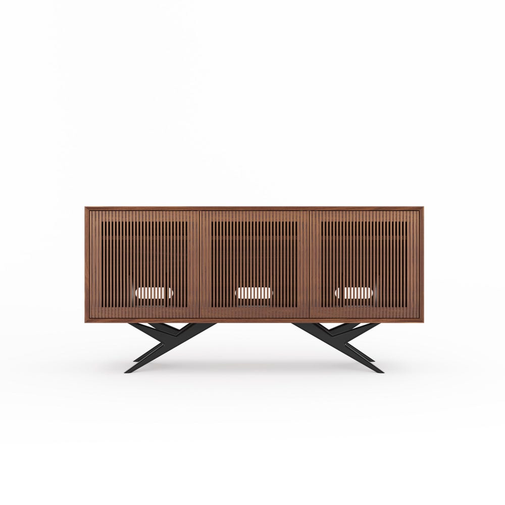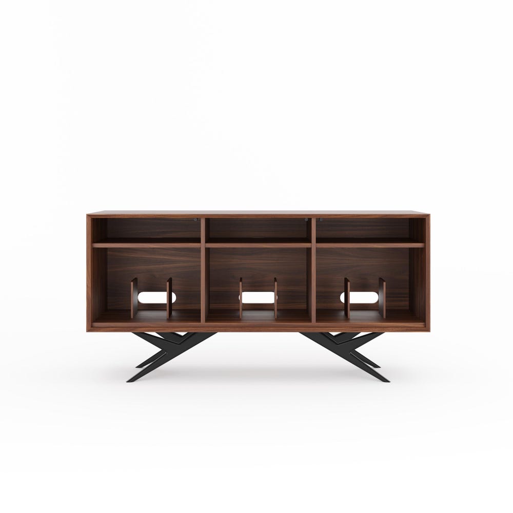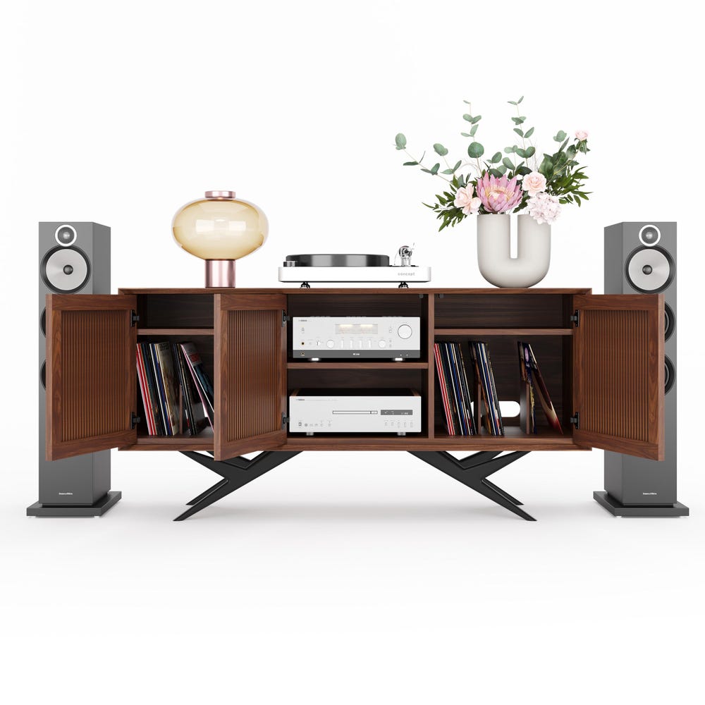Long walnut record player stand with three slatted doors and black, aluminum, organic shape base in mid century modern style. The cabinet includes removable record dividers and adjustable shelves , allowing you to customize the storage space to accommodate media equipment and vinyl records. Cable holes in back + shelves with cutouts for wire management. Shelves are ideal for storing an amplifier and receiver.