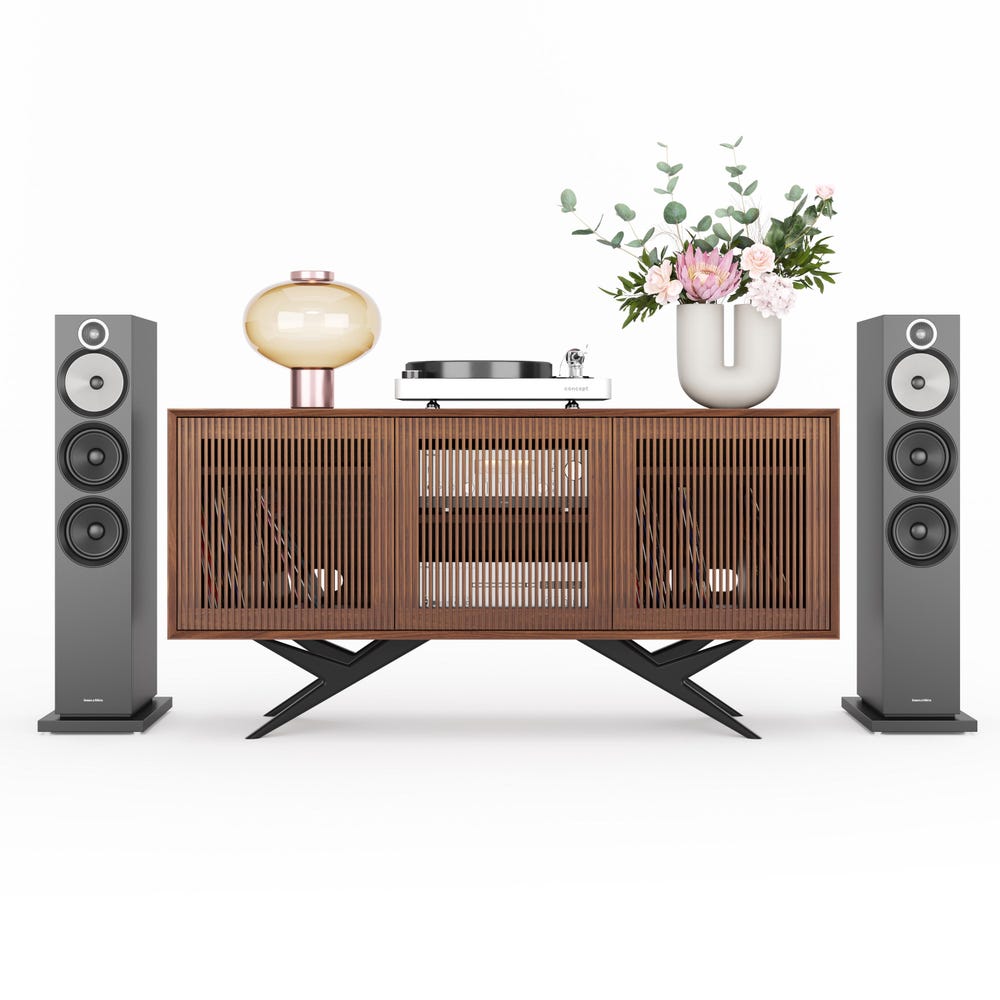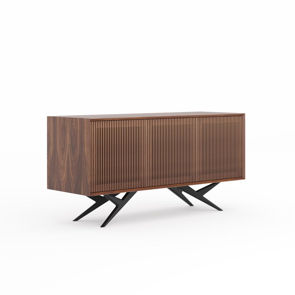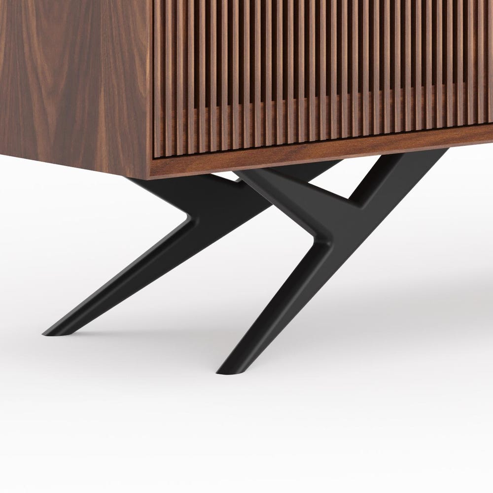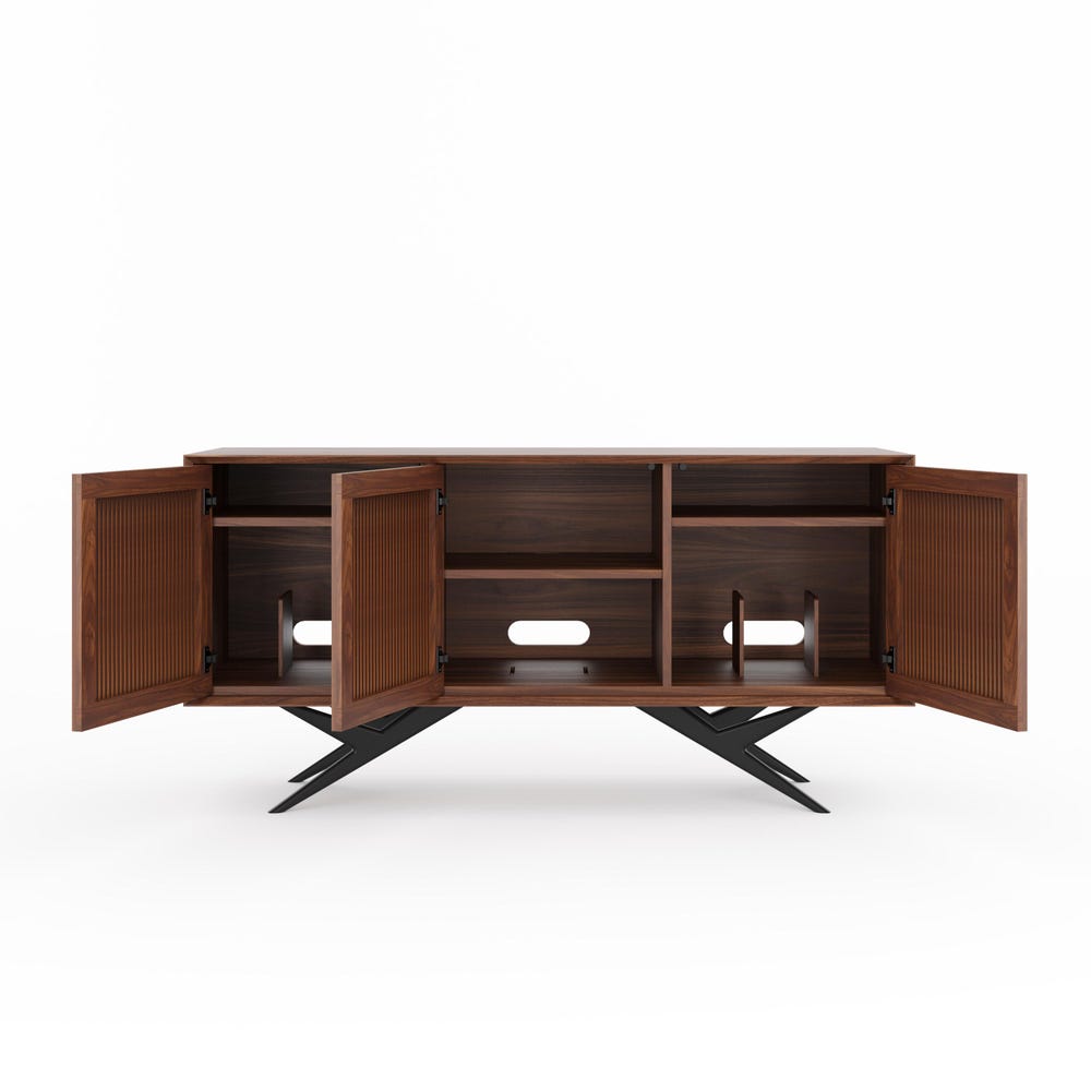 Long walnut record player stand with three slatted doors and black, aluminum, organic shape base in mid century modern style. The cabinet includes removable record dividers and adjustable shelves , allowing you to customize the storage space to accommodate media equipment and vinyl records. Cable holes in back + shelves with cutouts for wire management. Shelves are ideal for storing an amplifier and receiver.