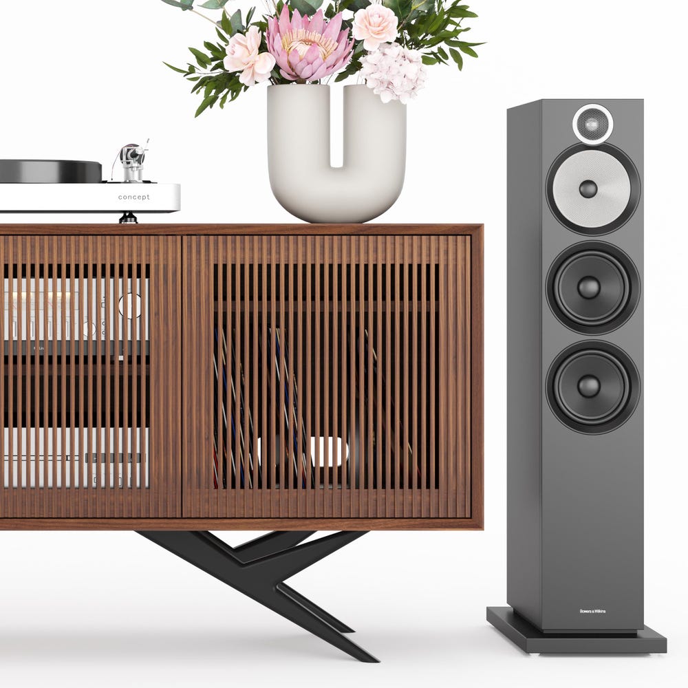 Long walnut record player stand with three slatted doors and black, aluminum, organic shape base in mid century modern style. The cabinet includes removable record dividers and adjustable shelves , allowing you to customize the storage space to accommodate media equipment and vinyl records. Cable holes in back + shelves with cutouts for wire management. […]