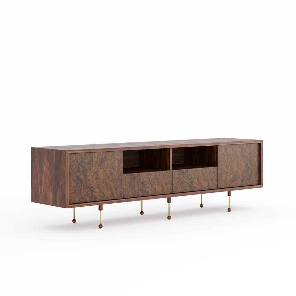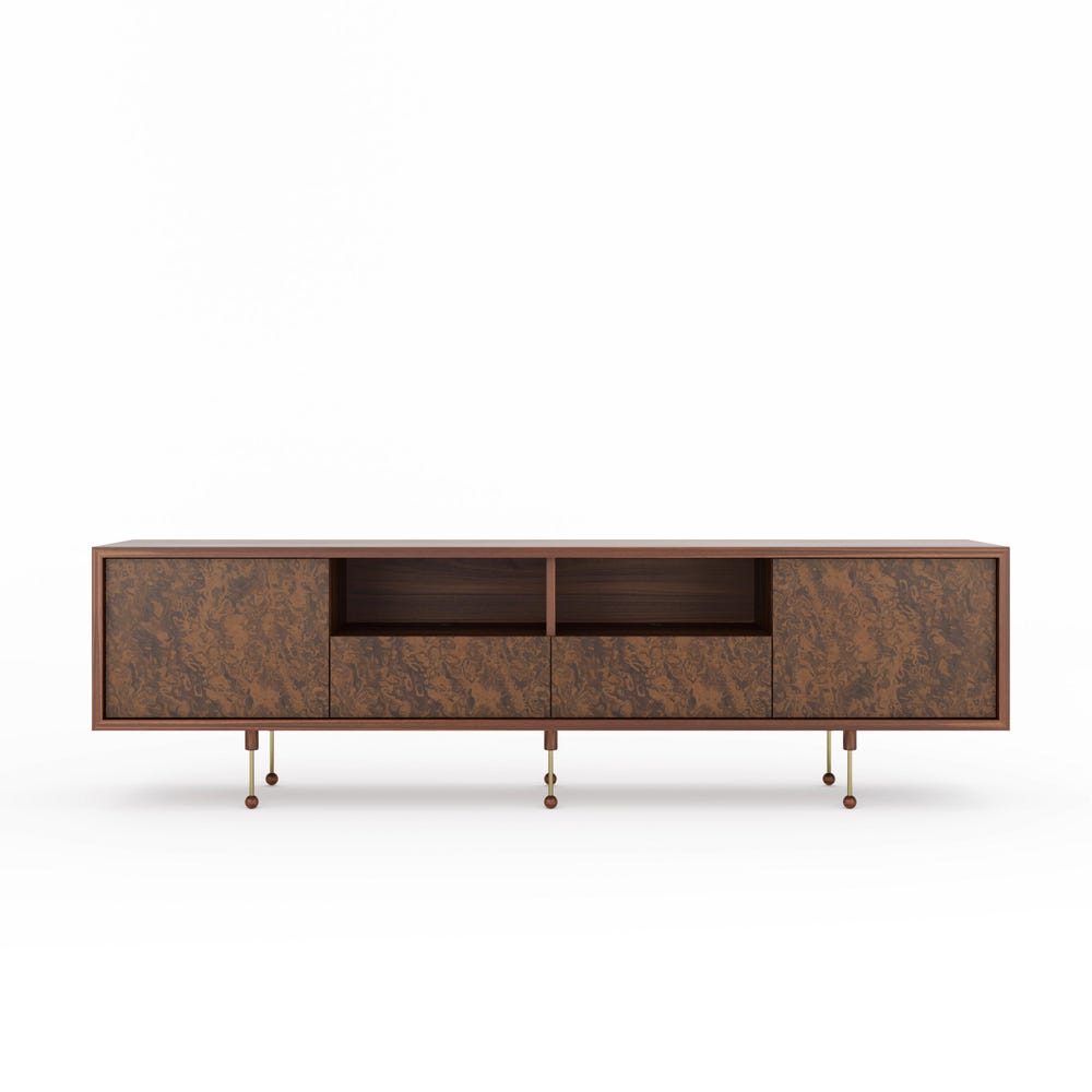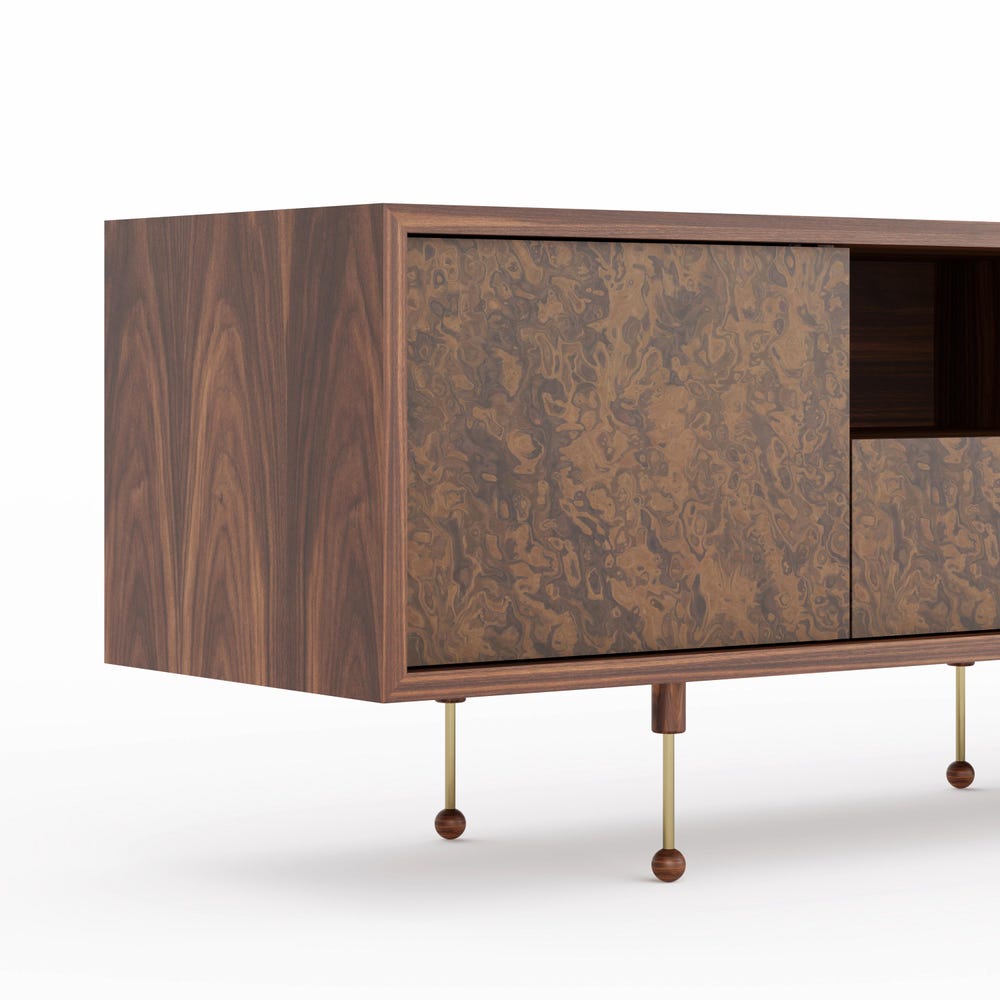 Sideboard made of wood covered with natural American walnut veneer and walnut burl veneer.
