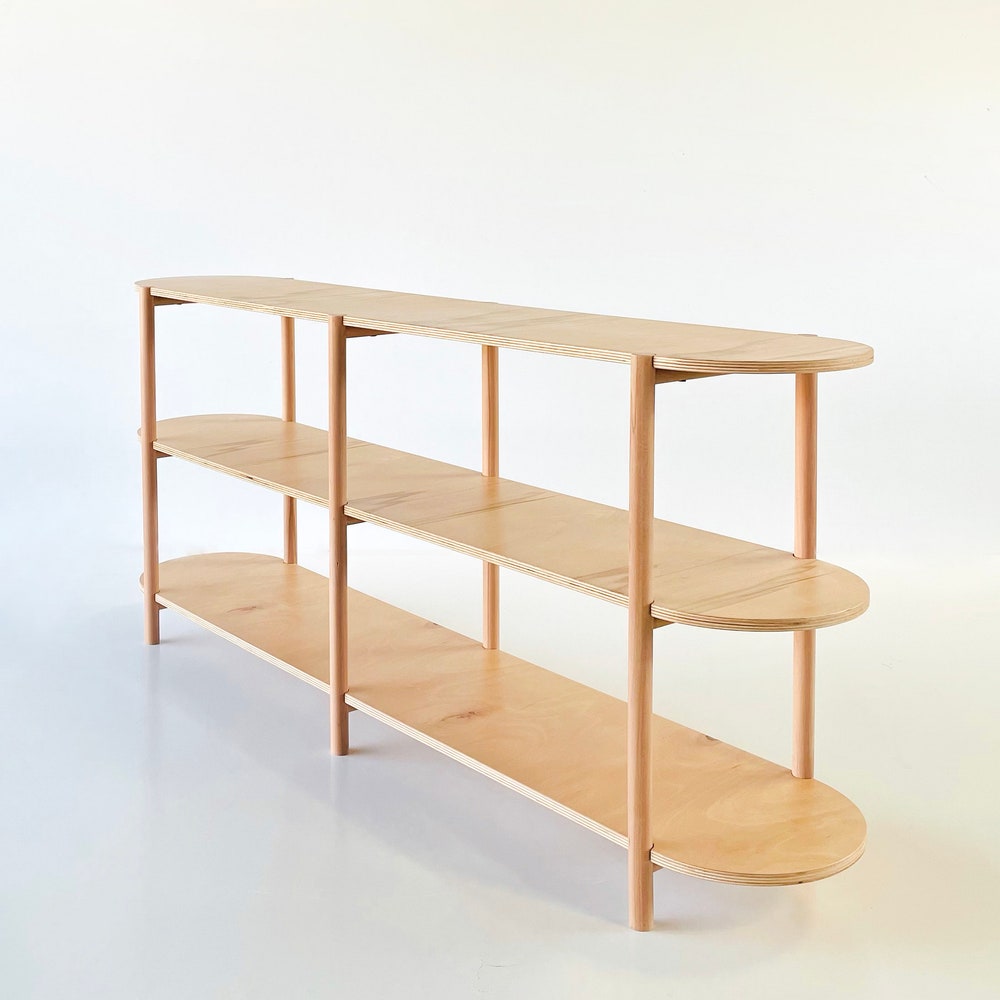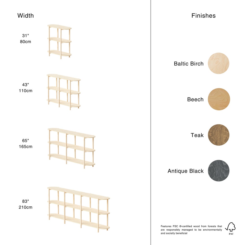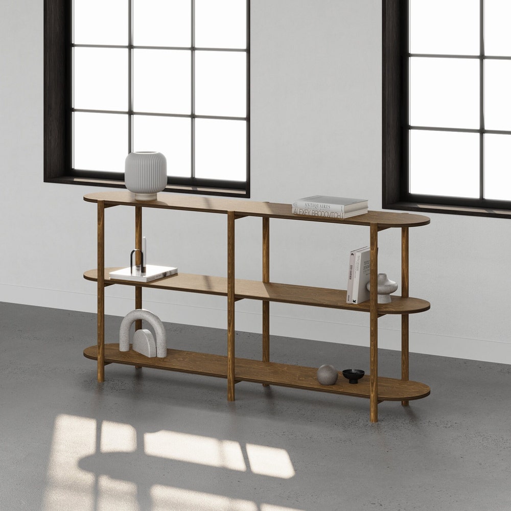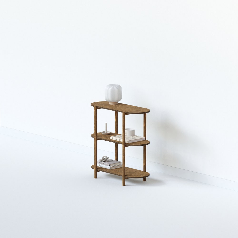 Choose from a variety of wood options to match your existing decor, and select the size that best suits your space requirements. With its clean lines and timeless appeal, our three-tier shelving unit not only elevates the look of any room but also provides practical storage solutions for your everyday needs.