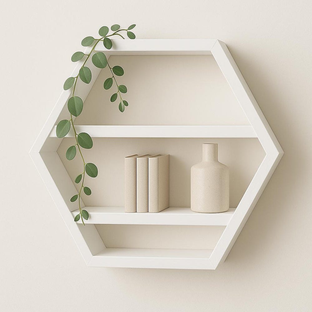 Luxury Handmade White Hexagon Wall Shelf – Modern Minimalist Decor – Solid Wood Statement Art Piece