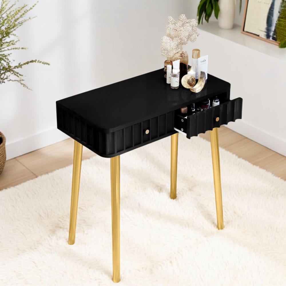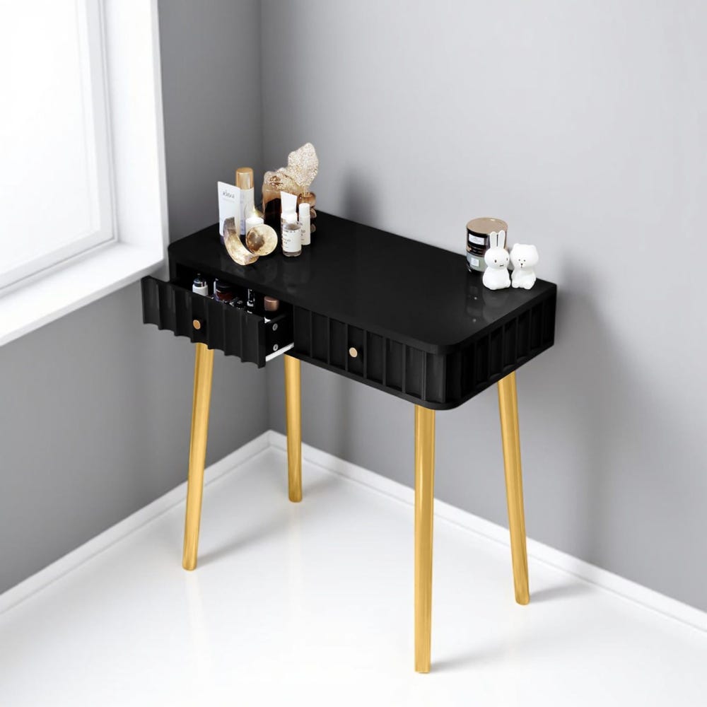 Add a touch of luxury and utility to your bedroom or studio with this elegant Glossy Black Makeup Vanity Desk. Featuring a smooth water ripple texture, durable construction, and two spacious drawers, this compact vanity is as functional as it is stylish—perfect for small spaces, apartments, or dorms.