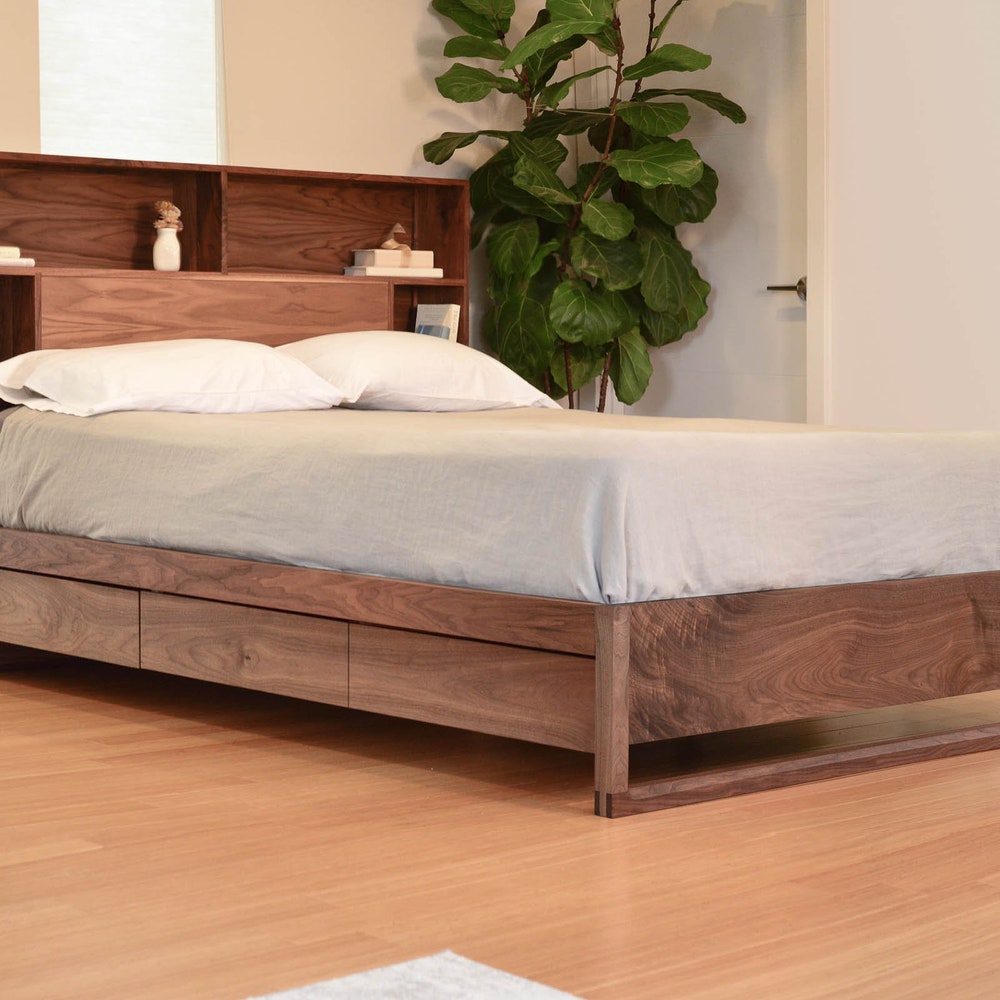 The Greenwood storage bed is equal parts efficiency and beauty. Handcrafted with non-toxic responsibly sourced materials in Seattle, WA to be a lifetime purchase. Designed around a solid hardwood storage headboard with 6 cubbies and a USB charging option, and a solid platform with 6 hidden softclose drawers.