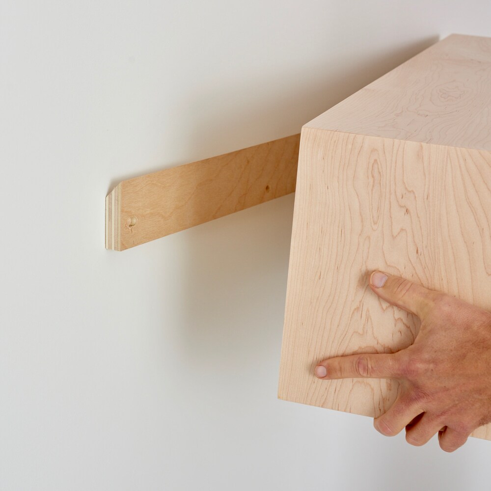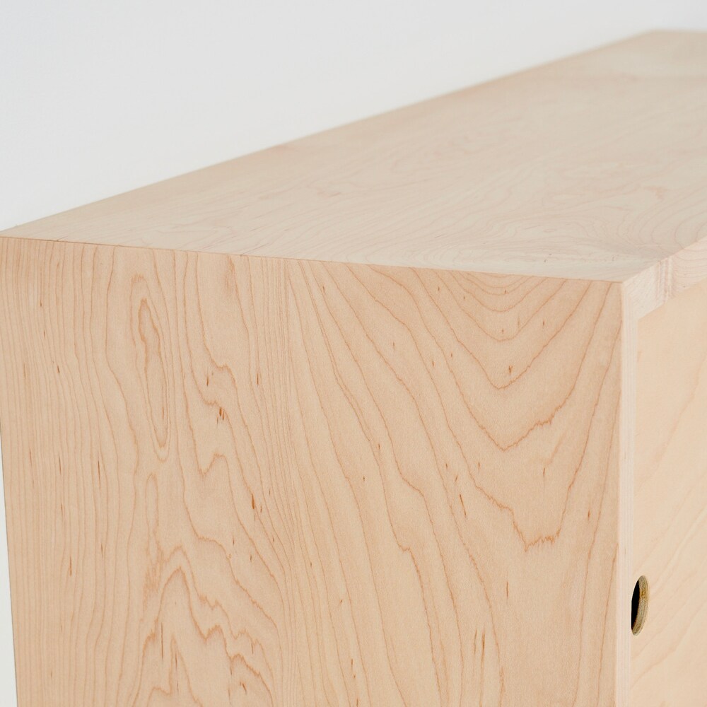 This floating storage cabinet is handmade from solid Northern Hard Maple with matching veneer sliding doors. We build each piece from solid hardwood boards joined with a 45 degree miter creating a beautiful wrap-around continuous grain.