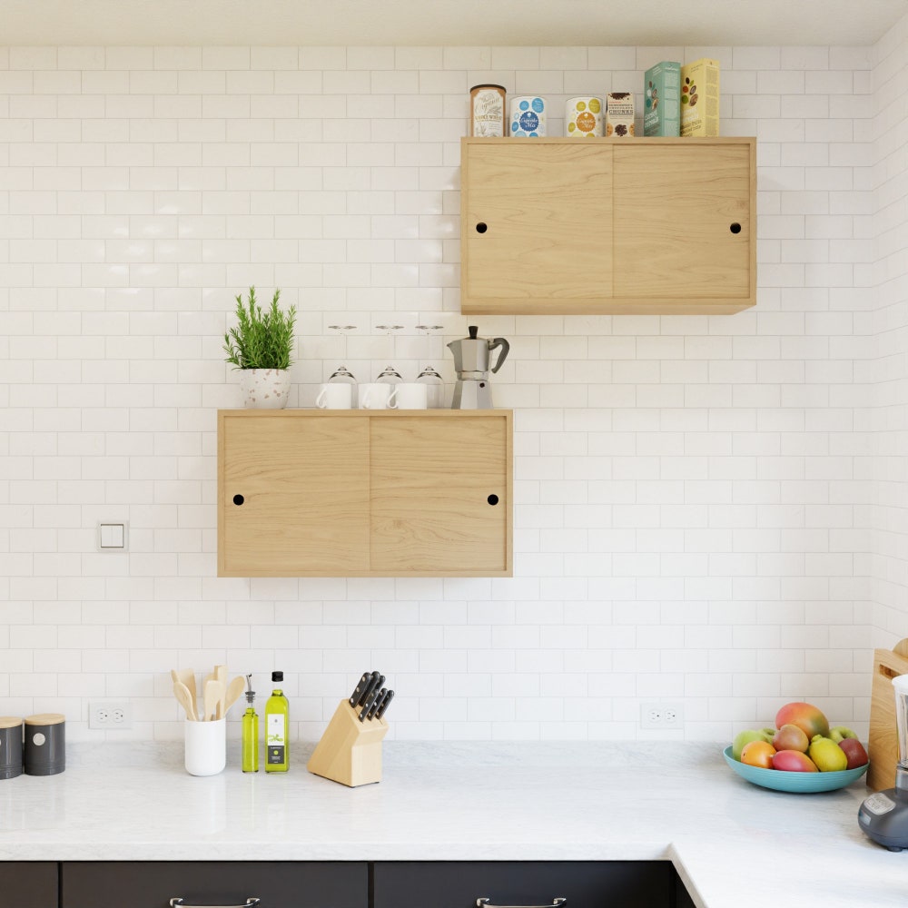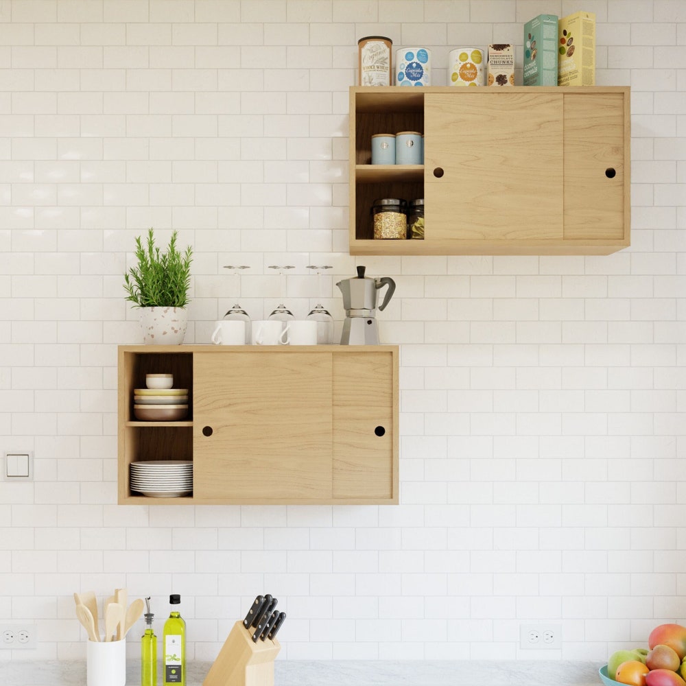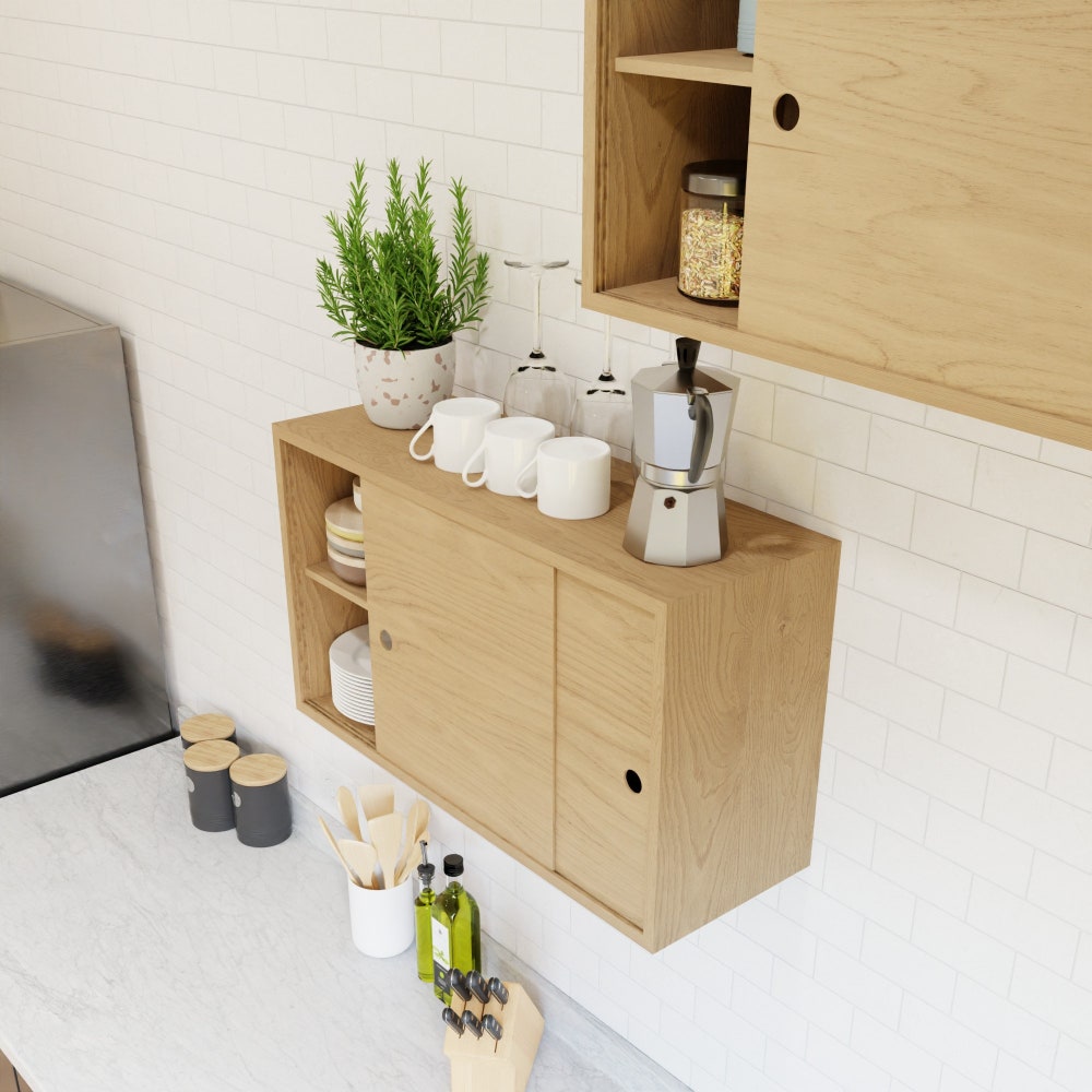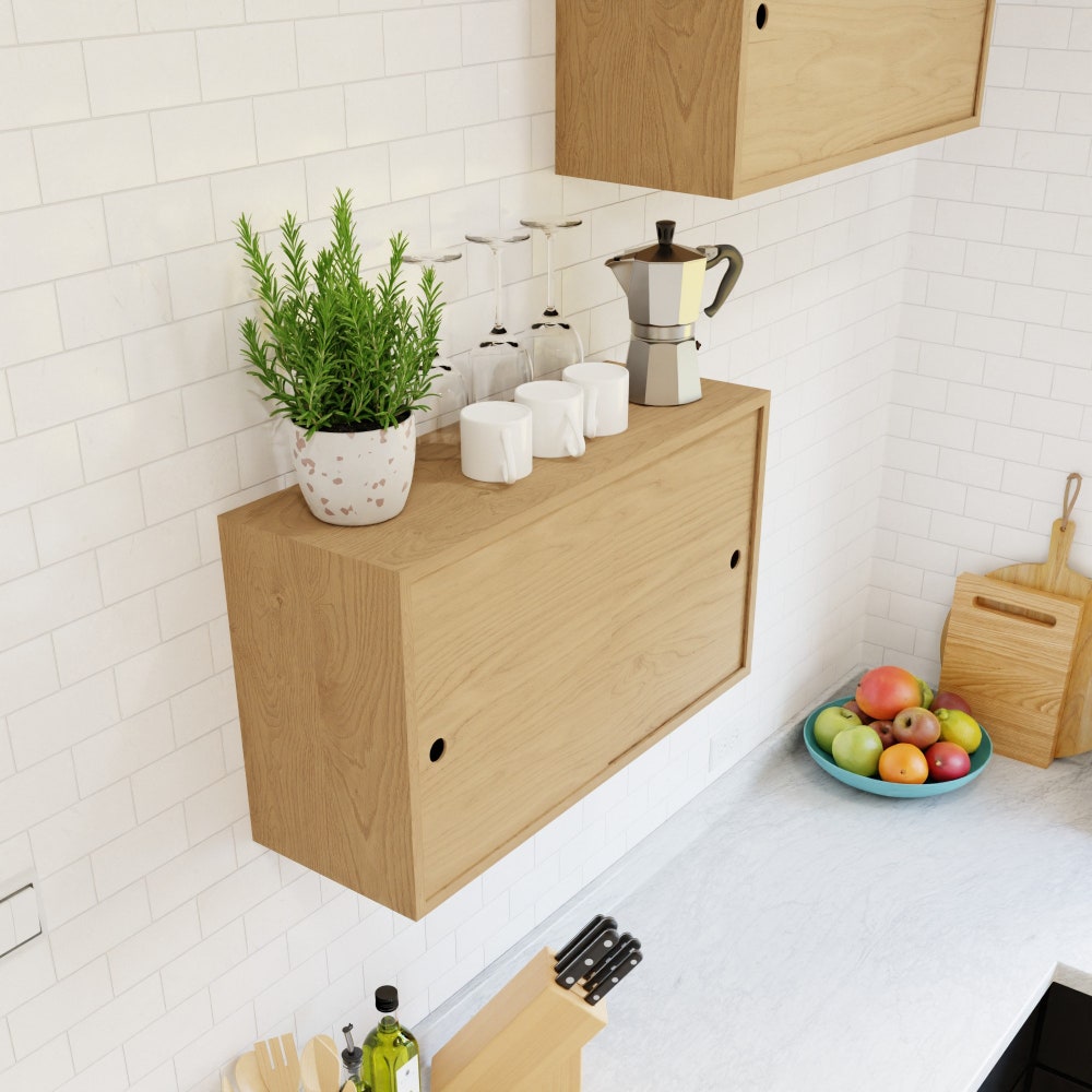 Our Floating Storage Cabinet is handmade from solid Hard Maple with matching-grain veneer sliding doors. This larger version of our standard floating storage cabinet has a fixed shelf behind the doors for versatile storage solutions for any room in your home.