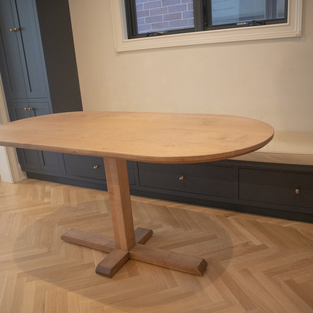 This maple table top sits on a matching pedestal base to create a practical kitchen table. The simple pedestal base makes this table pair well with built in seating. We build every table to order so there are many ways to make this table perfect for you.