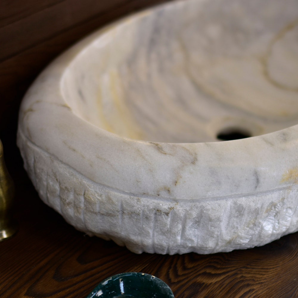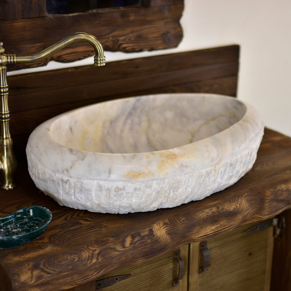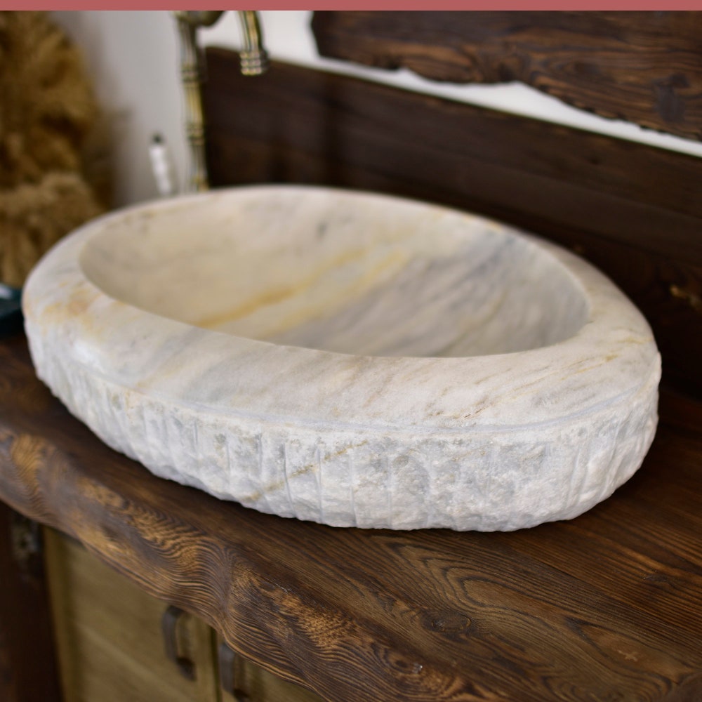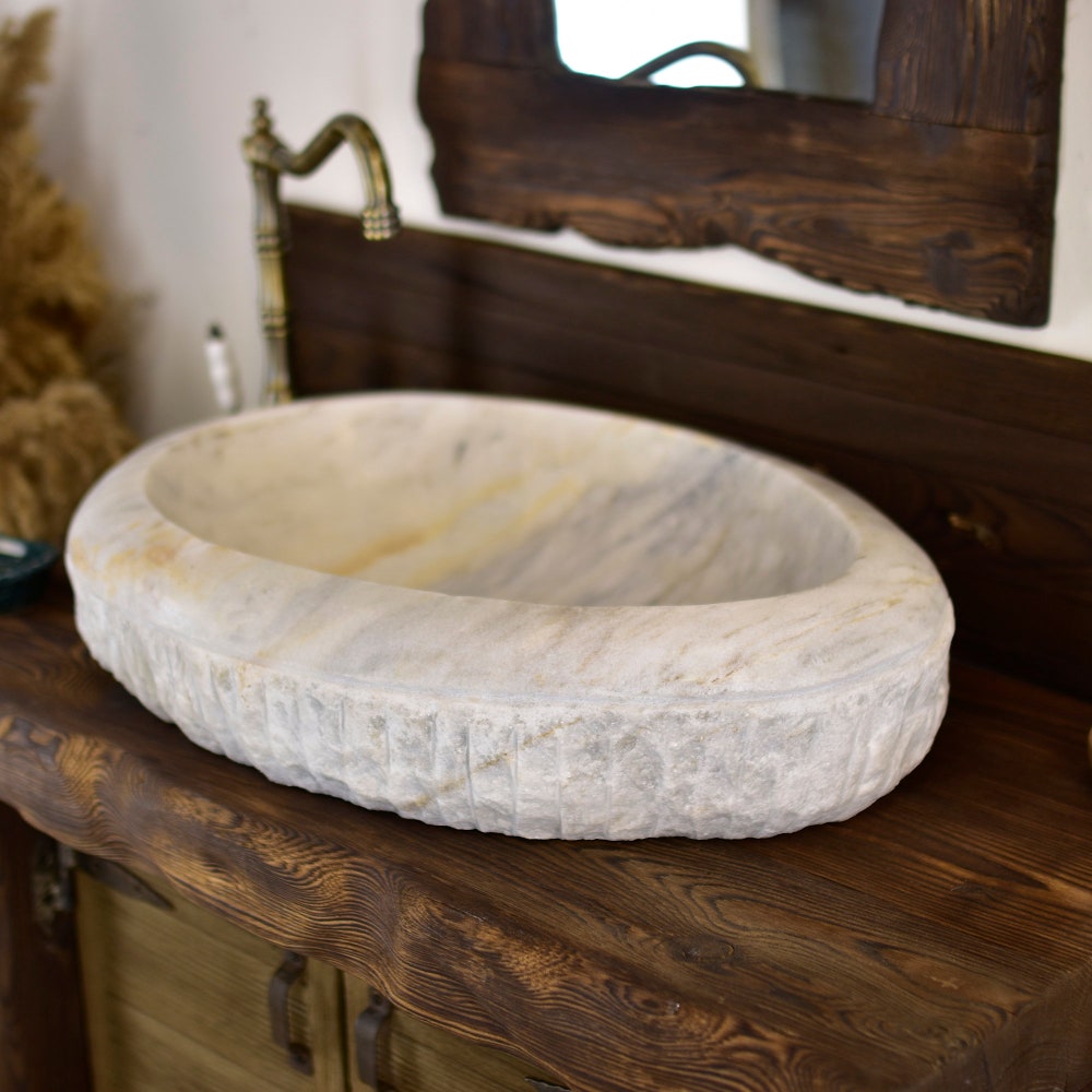 Imagine this stunning oval travertine marble sink, meticulously crafted with unparalleled craftsmanship and deep detailing. Hand-carved by an artist and decorated with subtle colored veins, this elegant round sink is much more than a bathroom sink. It looks like a true work of art, adding sophistication and elegance to any bathroom space.