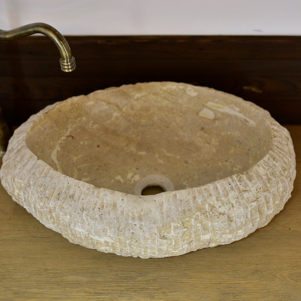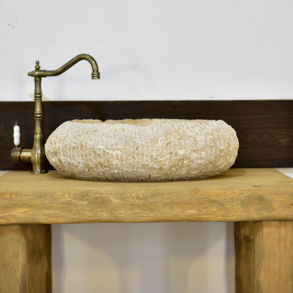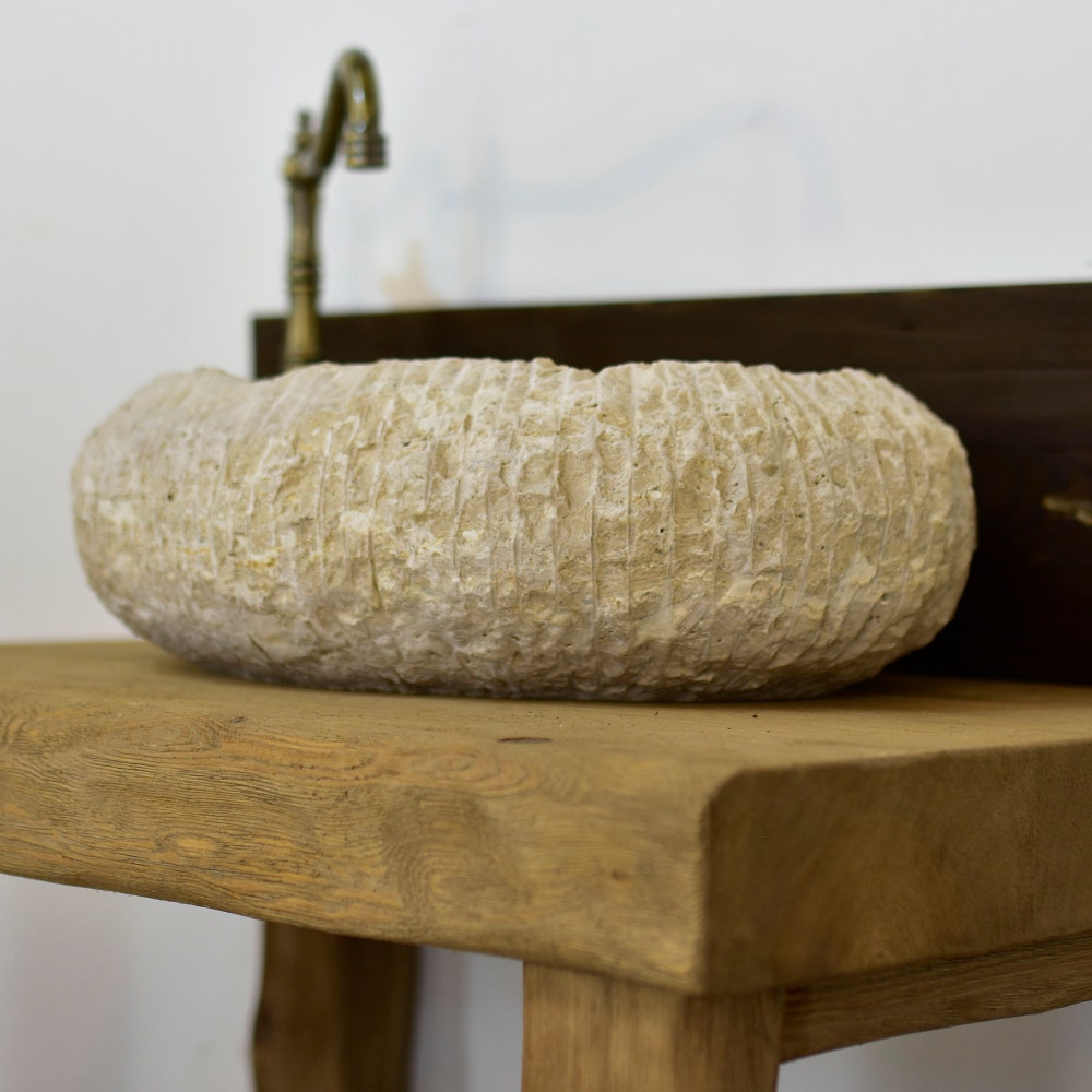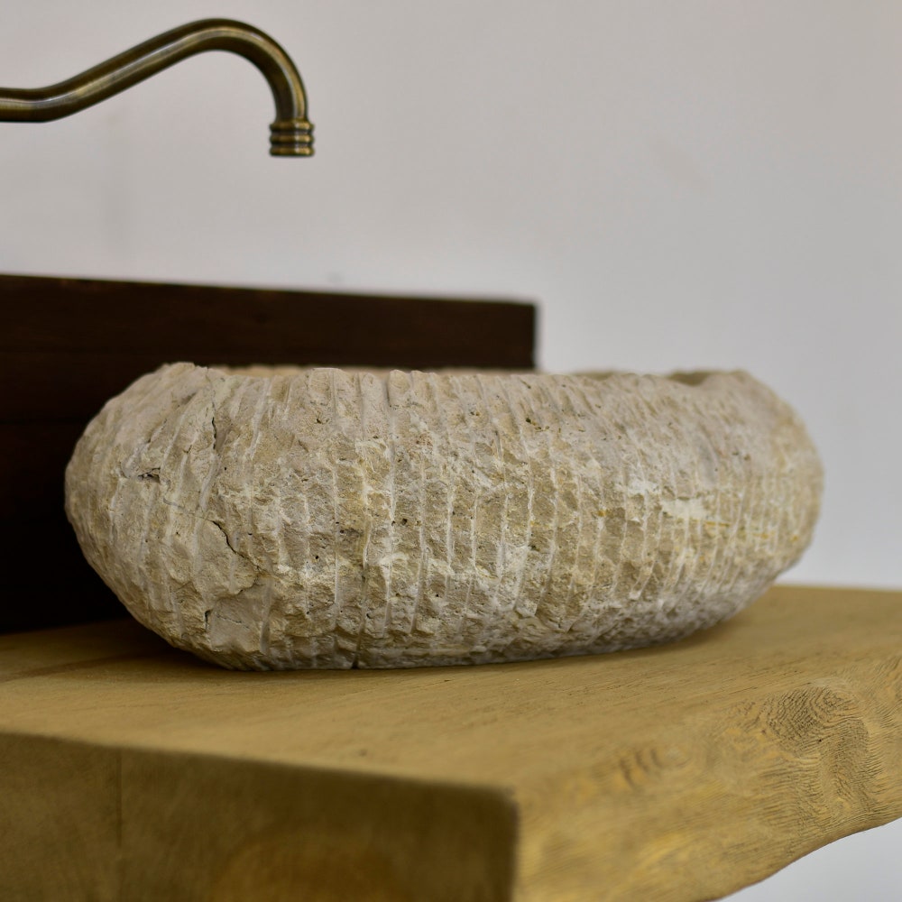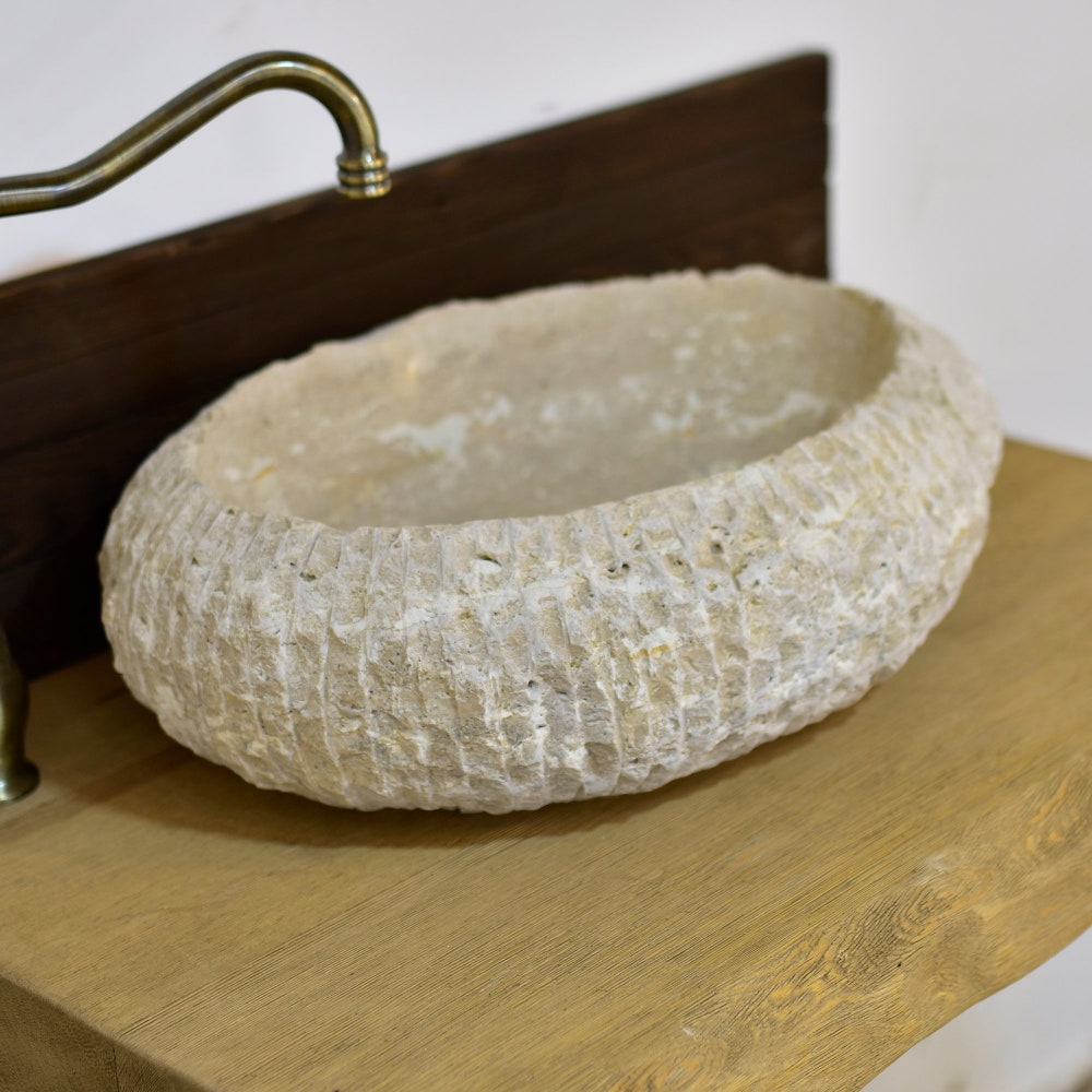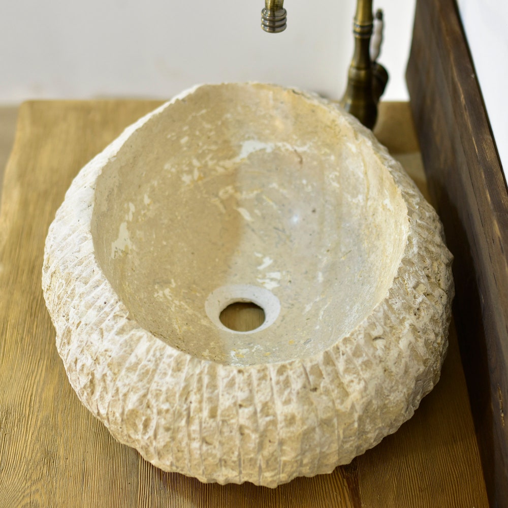 Imagine this stunning oval travertine marble sink, meticulously crafted with unparalleled craftsmanship and deep detailing. Hand-carved by an artist and decorated with subtle colored veins, this elegant round sink is much more than a bathroom sink. It looks like a true work of art, adding sophistication and elegance to any bathroom space.