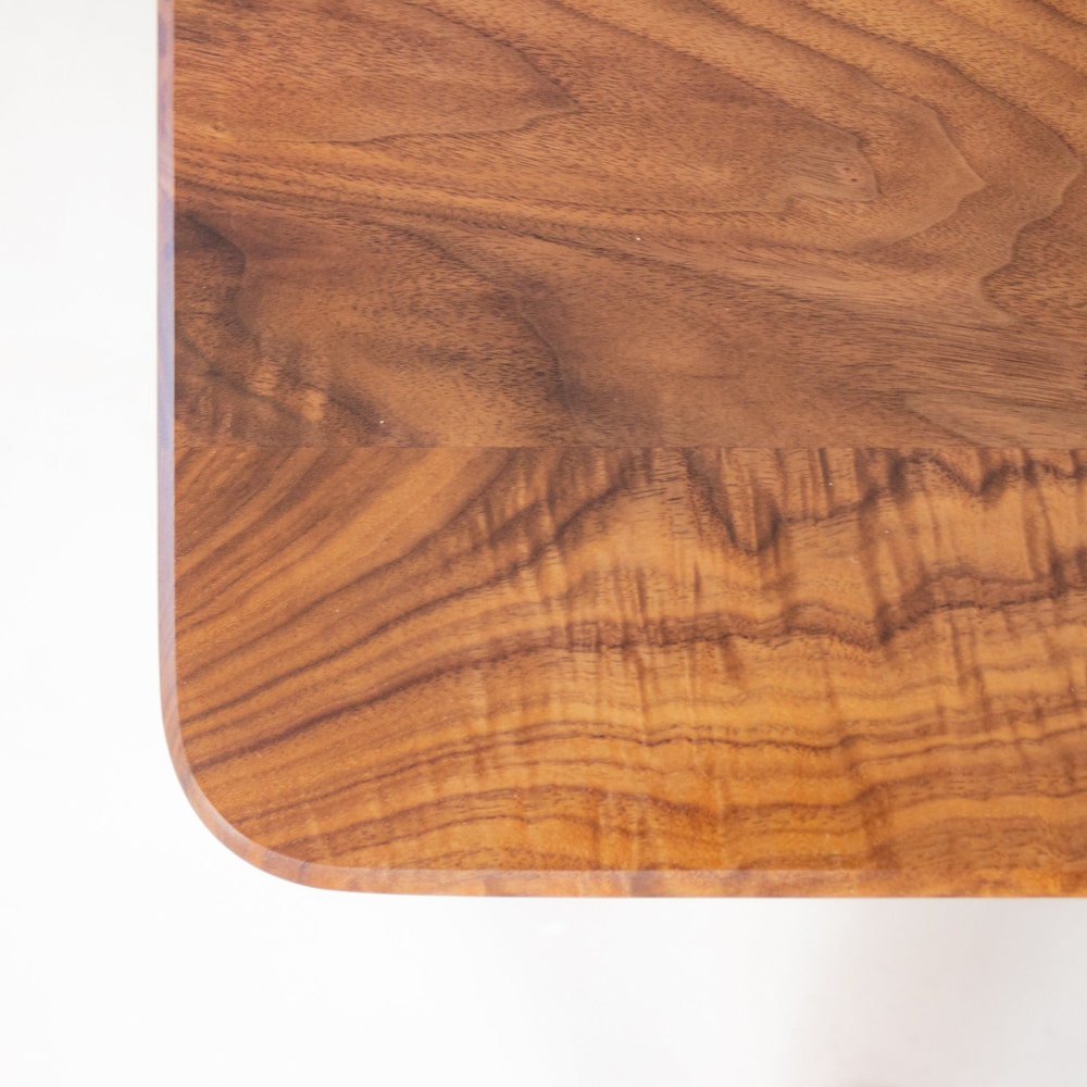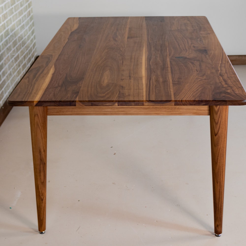 Add a midcentury flair to your dining room with this MCM dining table. Made of solid walnut with rounded corners and turned tapered legs, it has a delicate presence in a room. We build every table to order so there are many ways to make this table perfect for you.