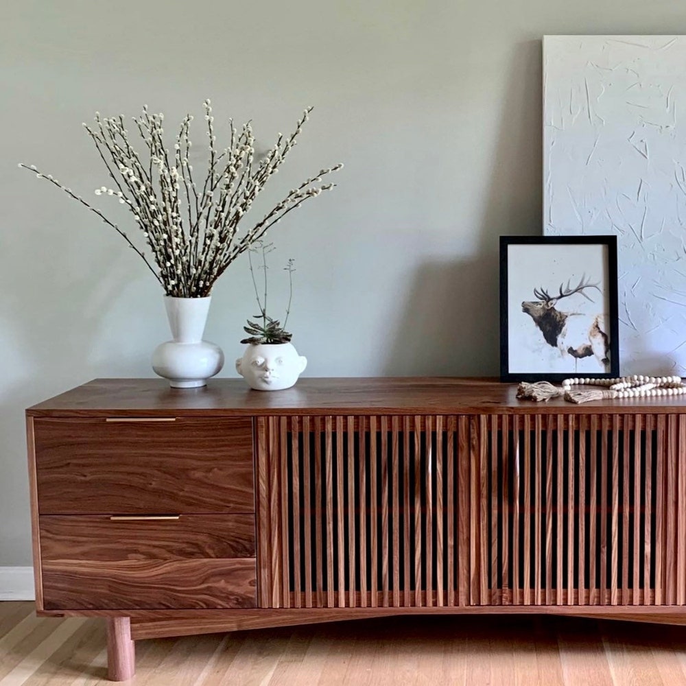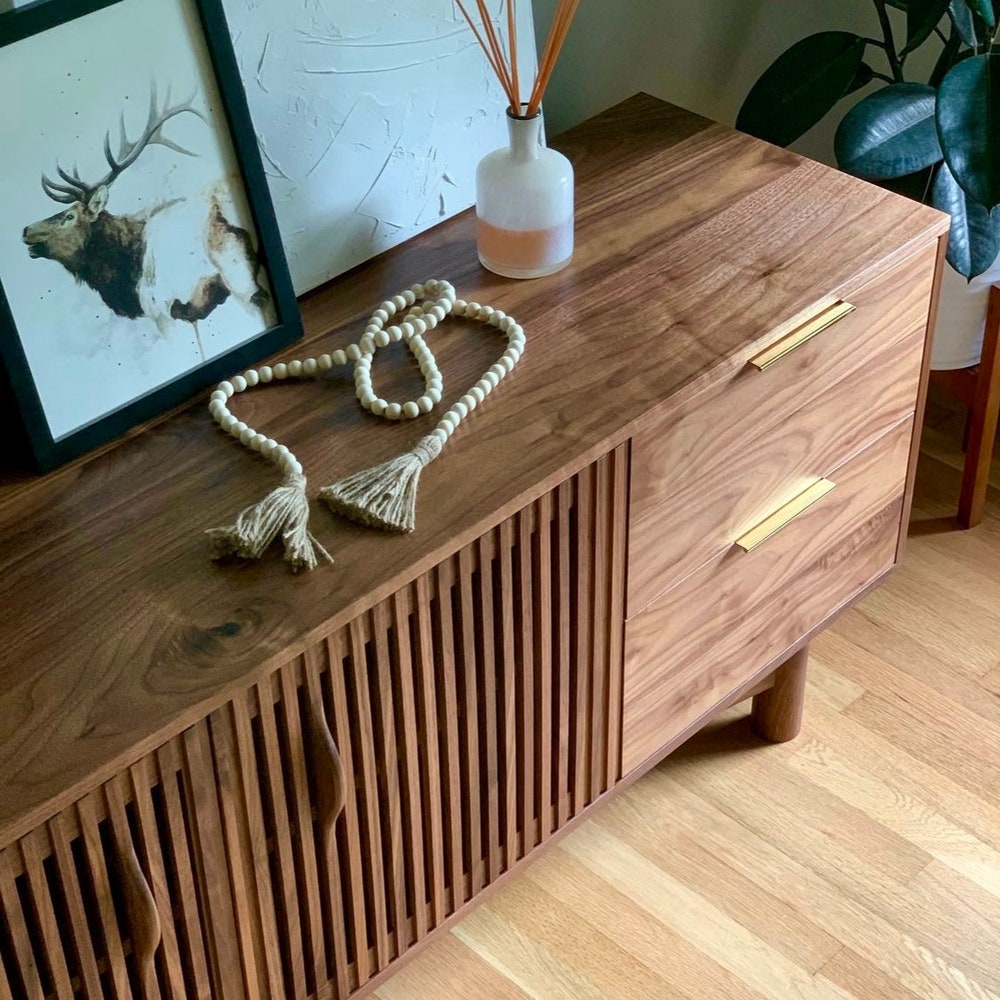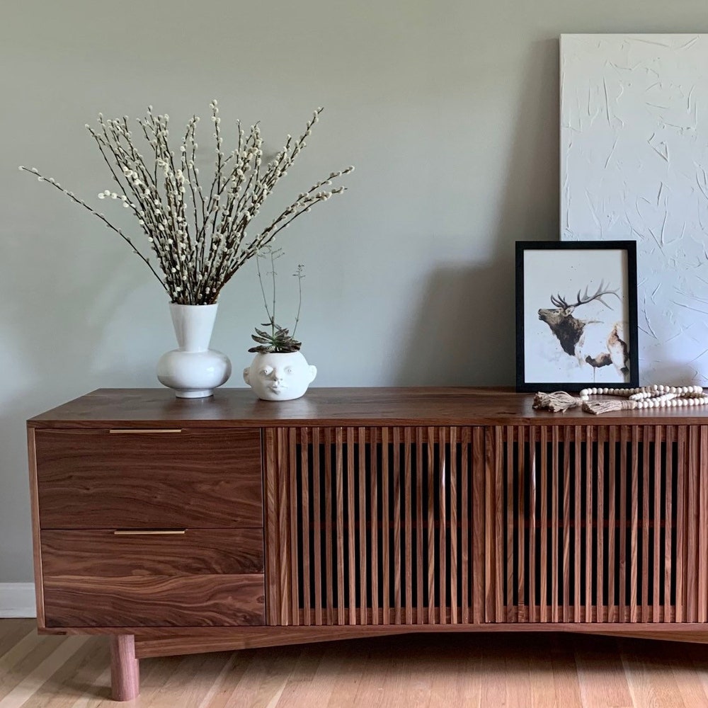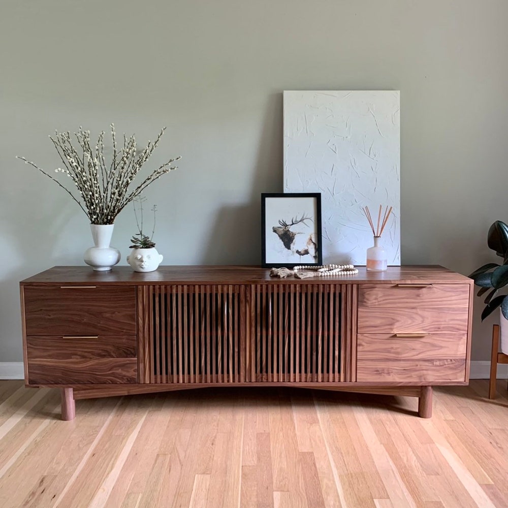 Gorgeous mid century media unit! Features four soft close drawers and one adjustable shelf behind the two louver doors. Ideal for hiding your cable boxes while also allowing for remote control penetration. A hole in the back panel for wire management can also be added. All solid wood construction. 75”W x 26”T x 17”D Shown […]