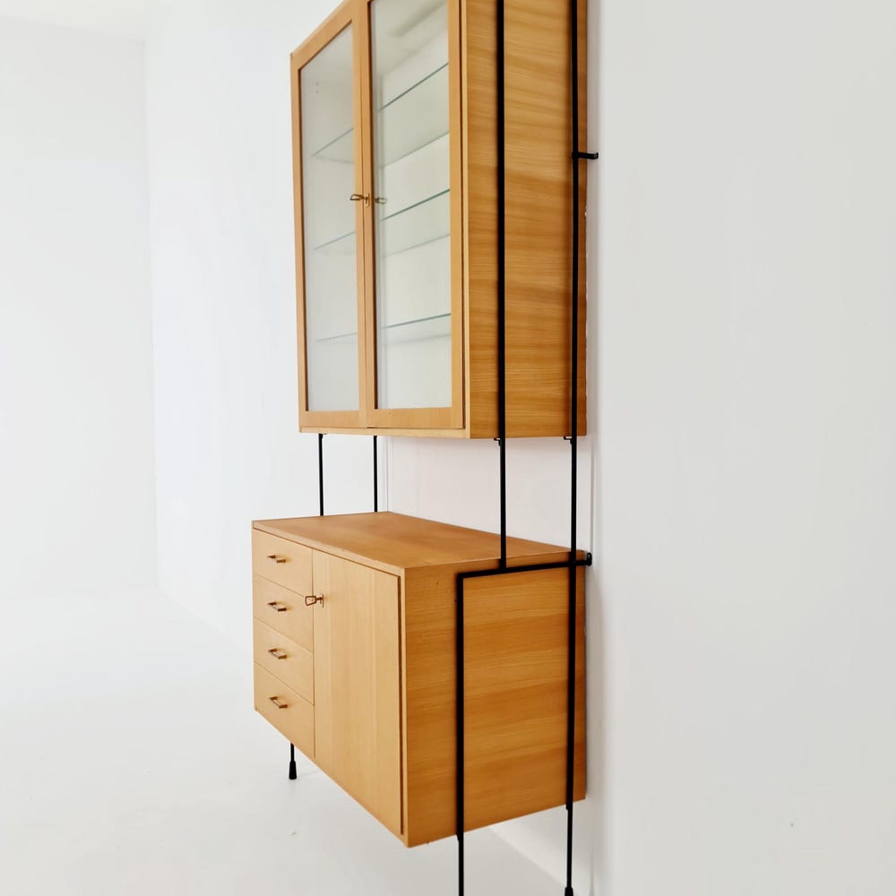 Designed by Hilker – Made from Ash – The individual units can have multiple configuration options The frame is fixed to the wall with screws – with pins fitting under each cabinet and shelf