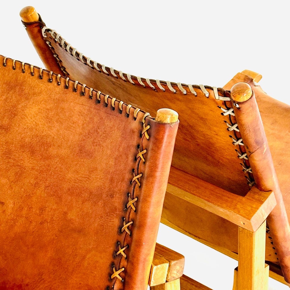 These rare Colombian low seat armchairs circa 1970 by Biermann from the Collection’S “Artesano” (meaning “handmade”) have a natural wood and thick leather frame on a thin metal frame stitched with beautiful cross stitches.
