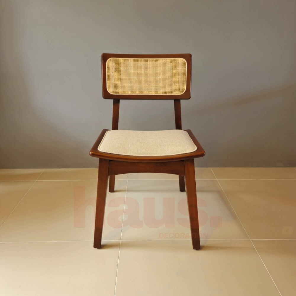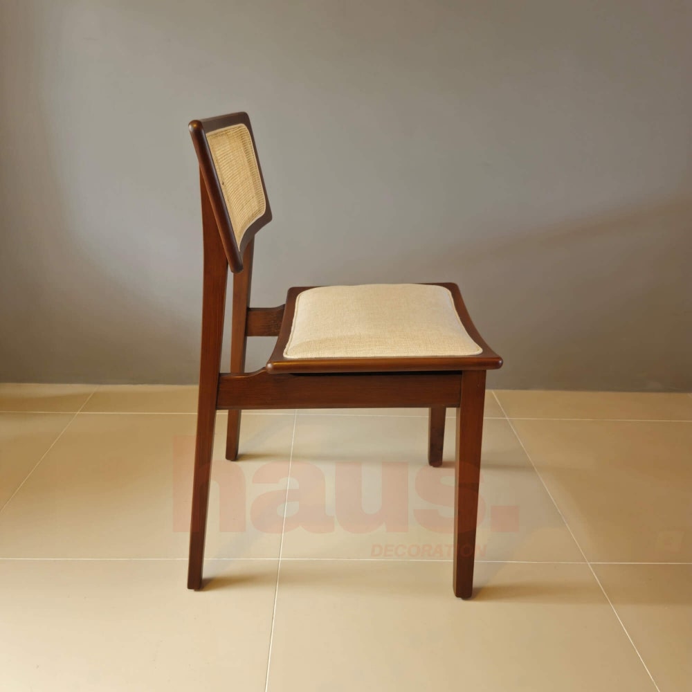 Introducing our handmade wooden chair, a perfect blend of traditional craftsmanship and modern elegance. With its sleek wooden frame, woven wicker backrest and padded linen fabric seat, this chair adds both comfort and aesthetics to any space.
