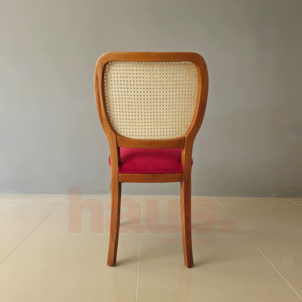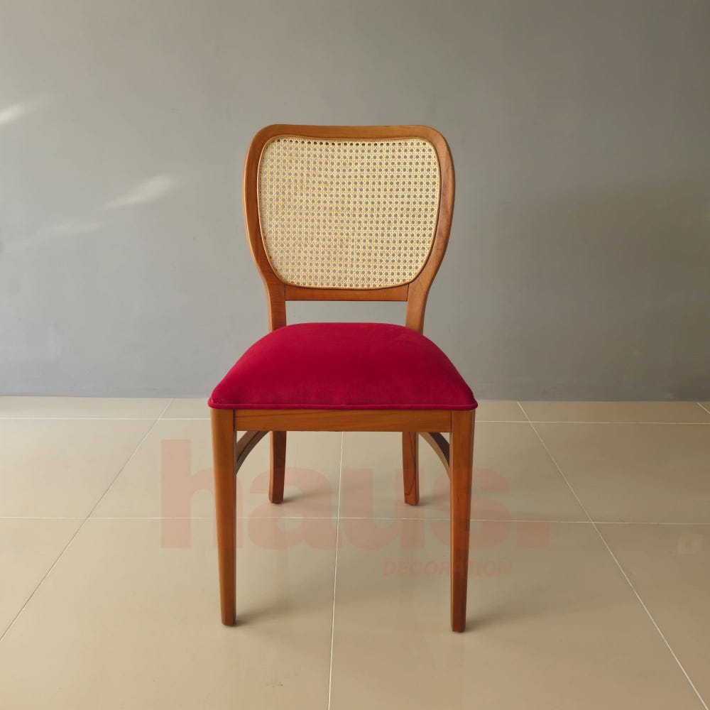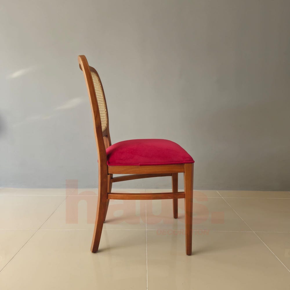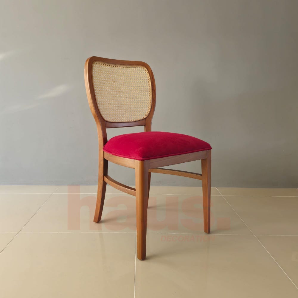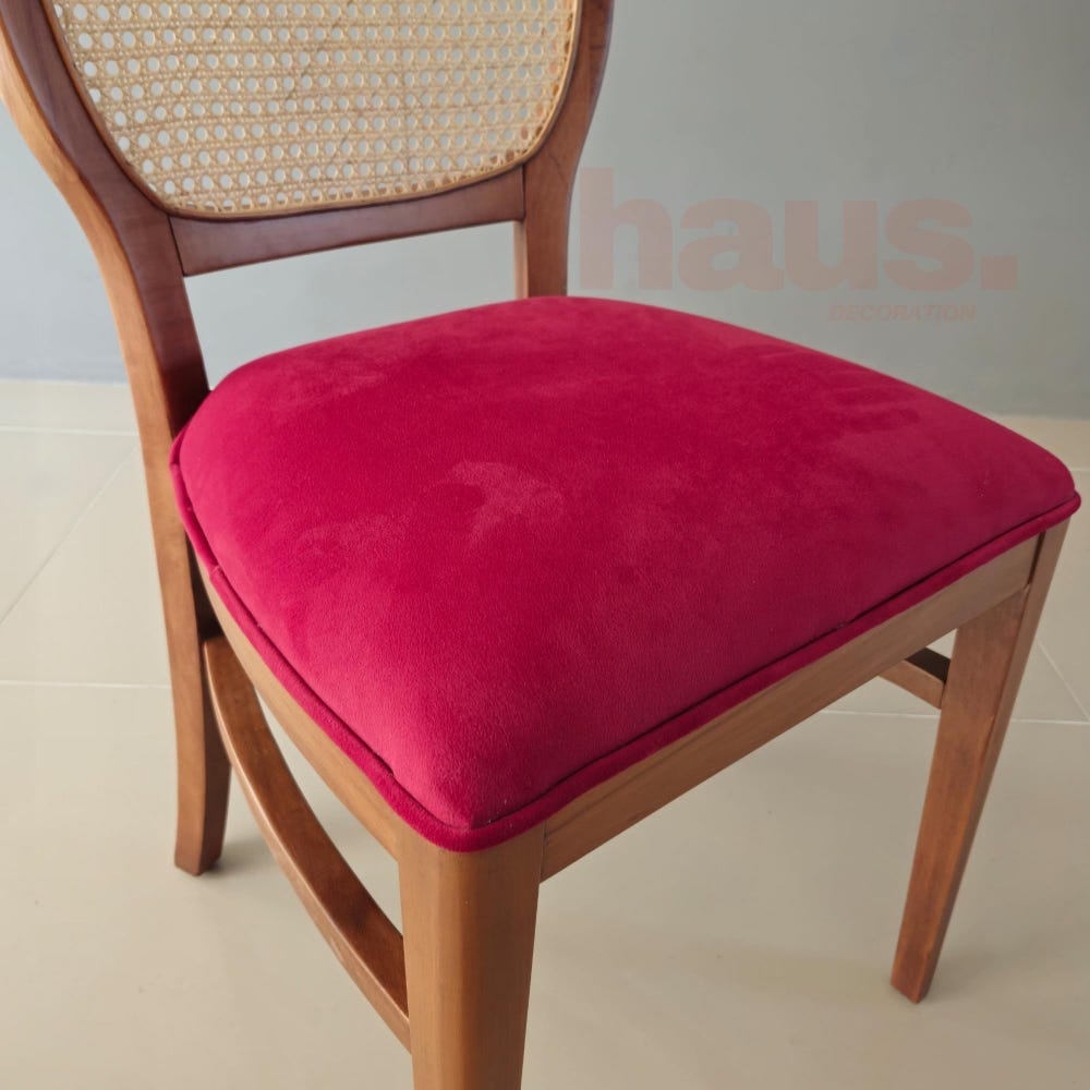 Introducing our handmade wooden chair, a perfect blend of traditional craftsmanship and modern elegance. With its sleek wooden frame, woven wicker backrest and padded velvet fabric seat, this chair adds both comfort and aesthetics to any space.