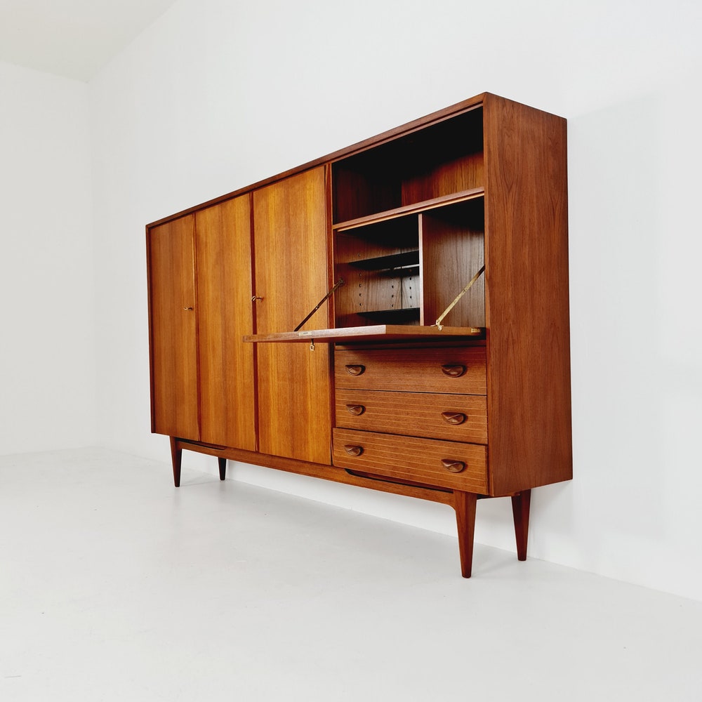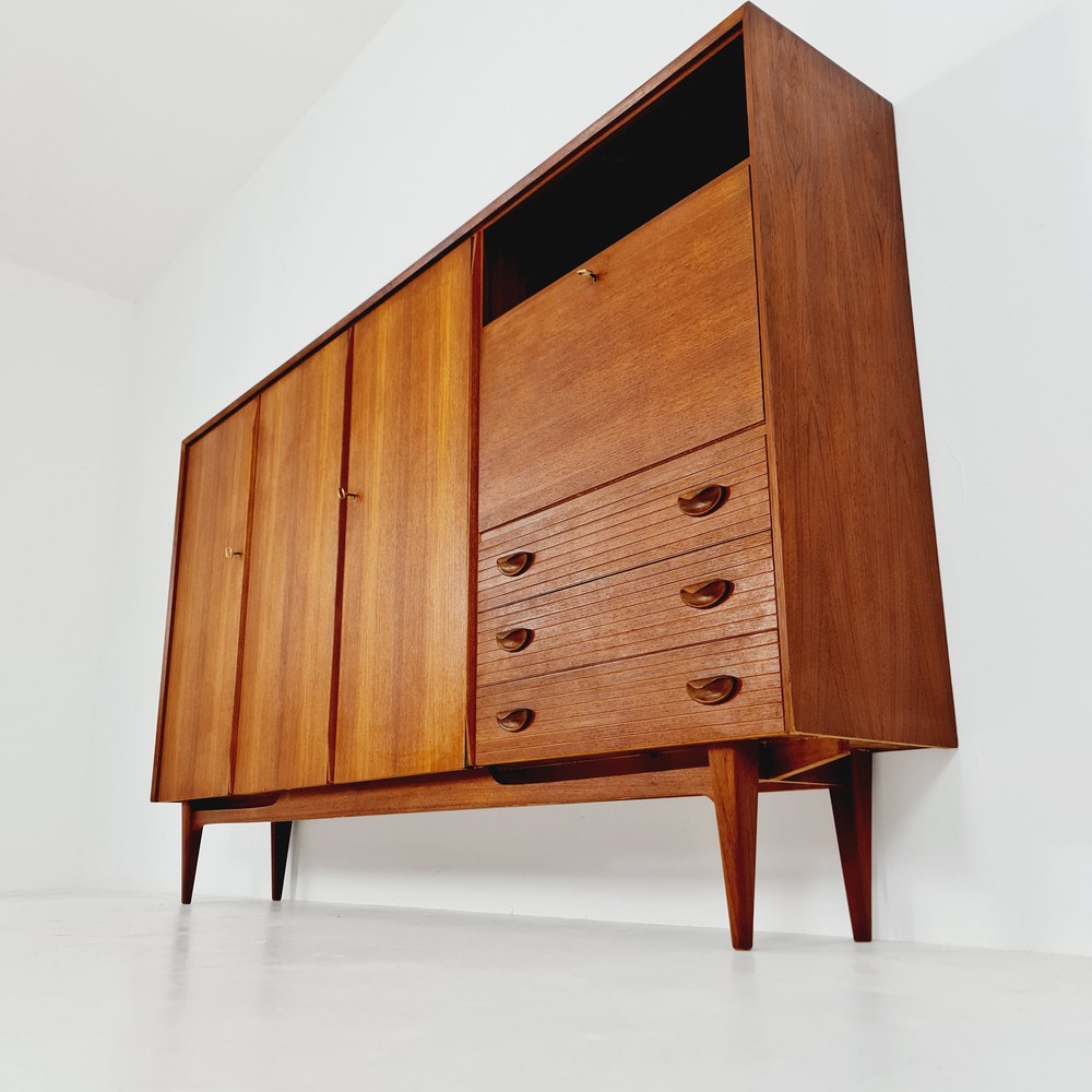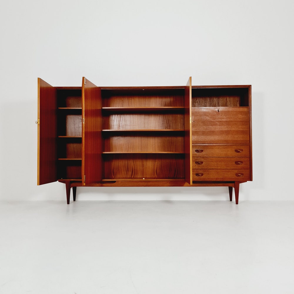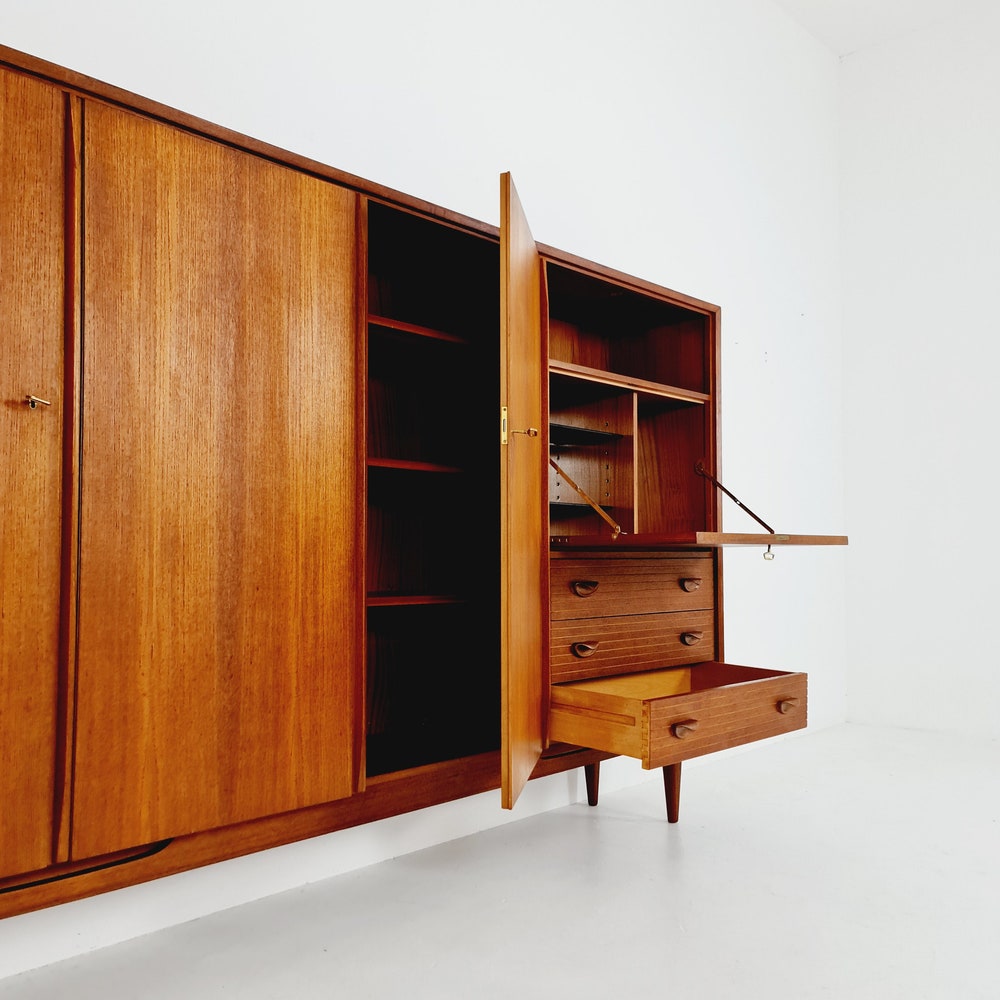 The furniture was designed in terms of dimensions and layout for plenty of storage space and offers plenty of space with three cupboard parts, the bar compartment and three drawers. In addition, the shelves have a solid wood edge and are individually adjustable in height. Light maple veneer was used for the interior, which contrasts nicely with the teak.