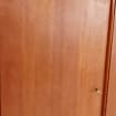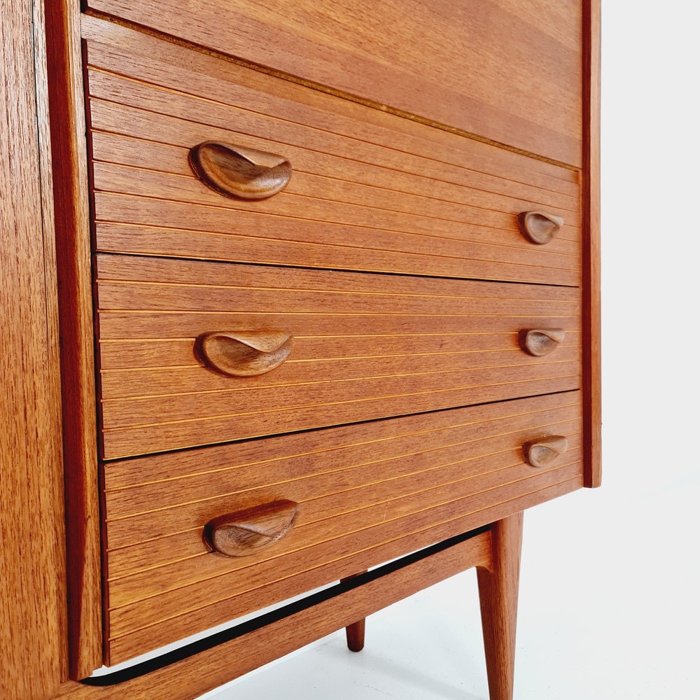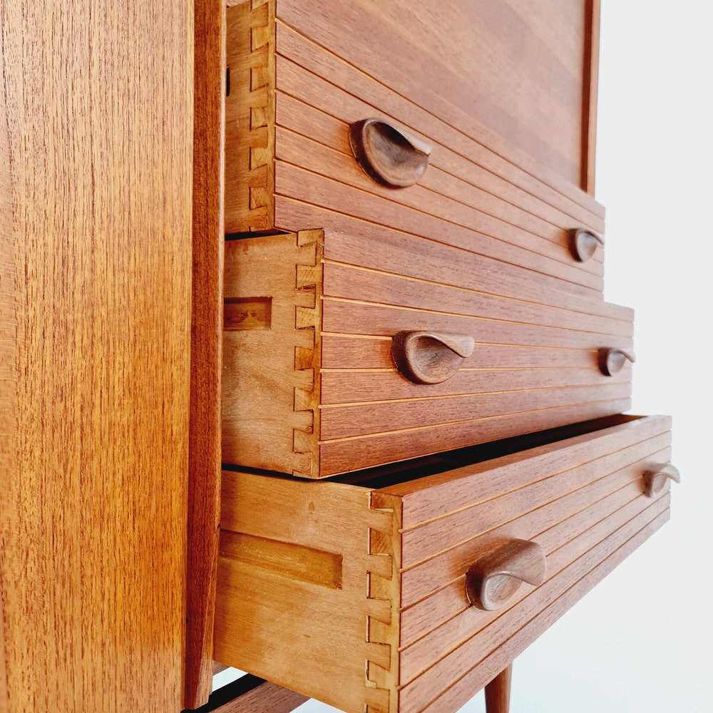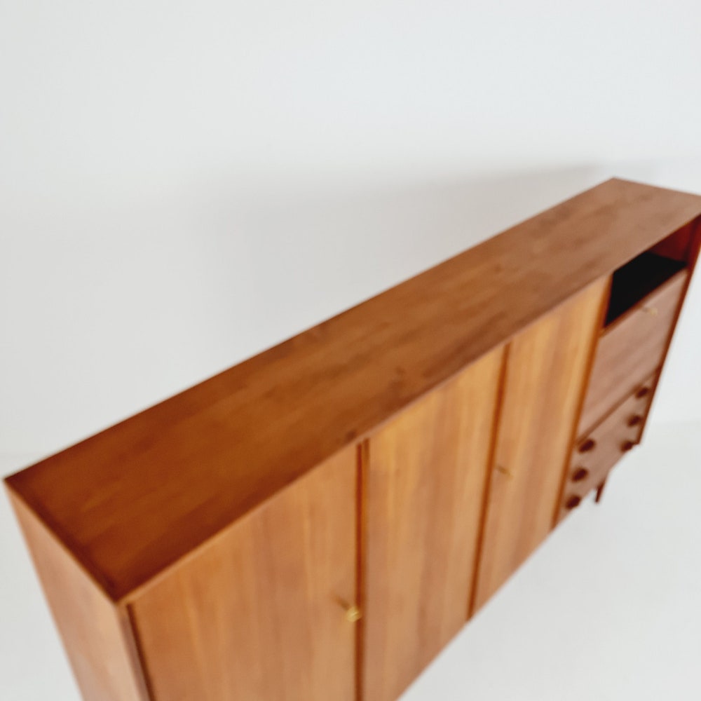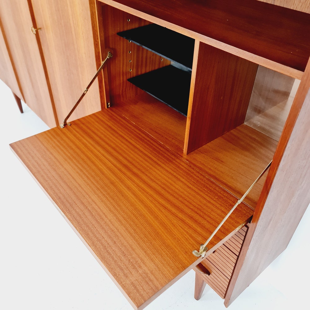 The furniture was designed in terms of dimensions and layout for plenty of storage space and offers plenty of space with three cupboard parts, the bar compartment and three drawers. In addition, the shelves have a solid wood edge and are individually adjustable in height. Light maple veneer was used for the interior, which contrasts nicely with the teak.