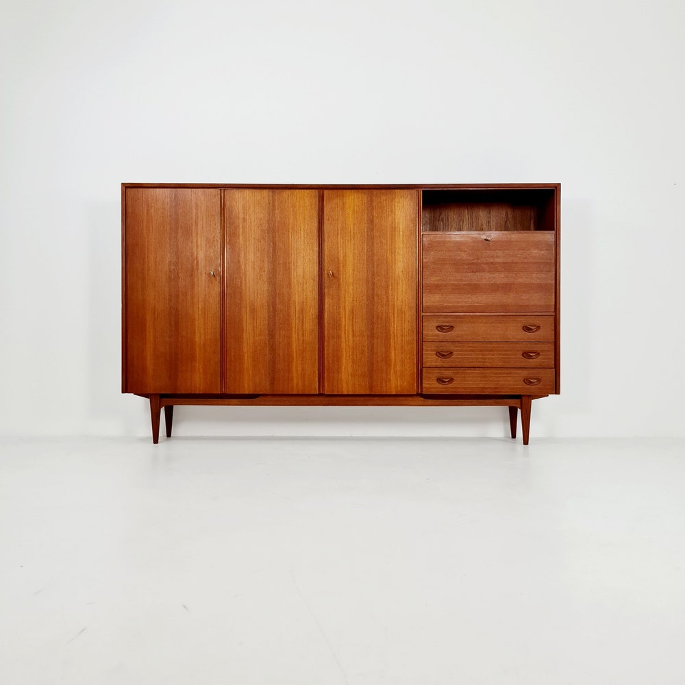 The high-quality highboard was produced by the manufacturer Omnia in the 1960s. The framing of the body, the six handles and the base are made of solid teak. The rest of the body is made of teak real wood veneer. The furniture was designed in terms of dimensions and layout for plenty of storage space […]