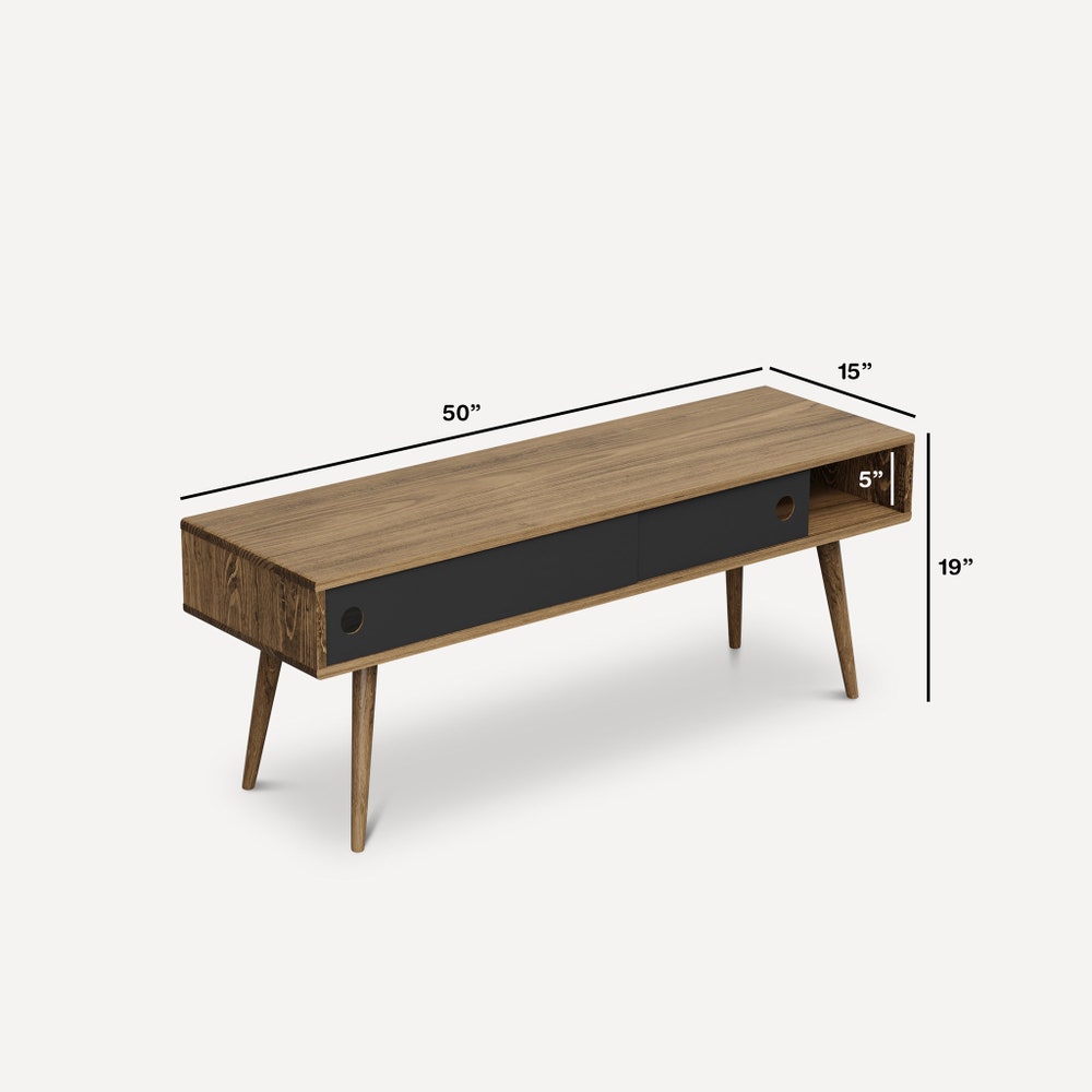 Retro splendor meets 21st century city slicker style in this shapely Sliding Door Media TV Stand. A clean silhouette is created from letterbox straight lines and either wooden or hairpin brass legs lend just enough curve to bring a hint of contemporary influence. The sleek wood grain is given an added dose of oomph thanks to the dolce cream tones of the seamless sliding doors.