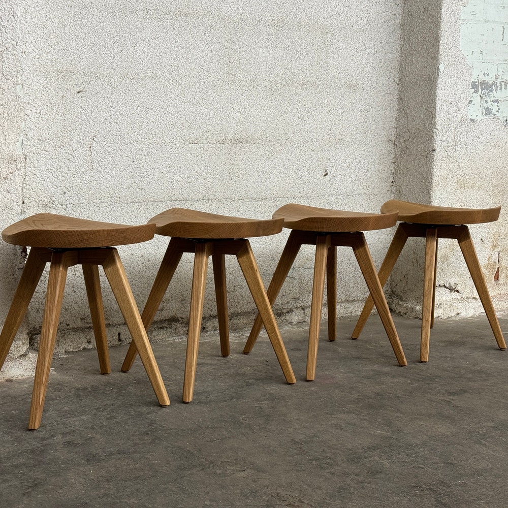 This mid century modern swivel dining stool is built using premium solid hardwood. Each seat is created by carefully selected boards whose figuring accentuates the seat’s form. Solid wood varies piece by piece and we ensure that all the stools in your order have harmonious figuring. We then carve each seat precisely to the final shape, fine-tuning lines and surfaces by hand. The stool frame is built using mortise and tenon joinery, built to last.