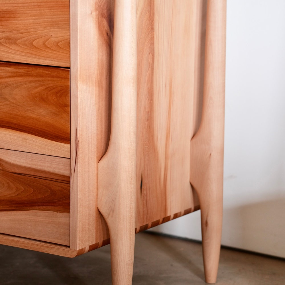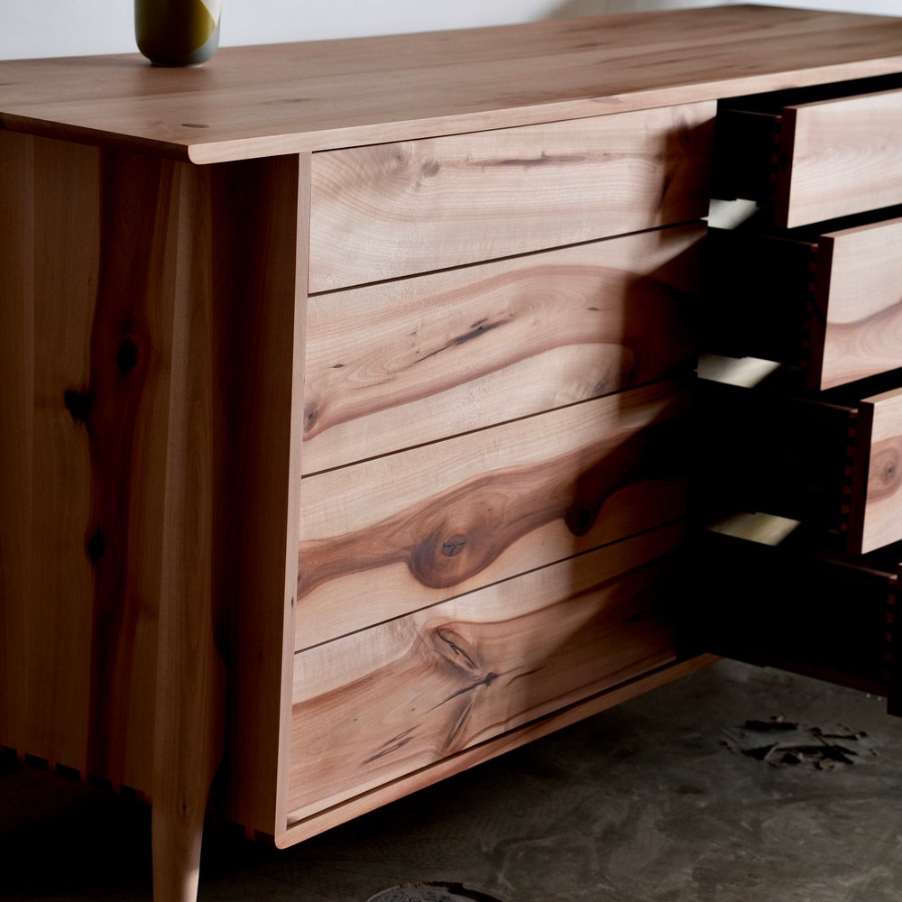 This dresser is made from all solid wood, including the drawers and built using several forms of exposed joinery and hand shaping. I would put this piece closer to a form of art than pure function. The exposed dovetail case, exposed through tenons on the top, the exposed box joints on the drawers, and the extensive shaping of the legs makes this a subtle but fascinating piece. Our only goal at Beauty and Bread Woodshop is to design useful pieces of furniture that are undeniably interesting and with this piece I believe we have achieved what we set out to do.
