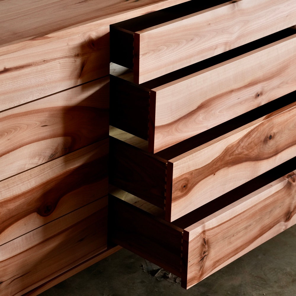 The first photo here is of Madrone which creates a really cool Artscape. This is a wood found in the Pacific Northwest and that we have in stock at most times. the darker wood in the later photos if western walnut. there are a lot of options when it comes to wood choice and drawer pull detail including push to open drawers that will not require any hardware.