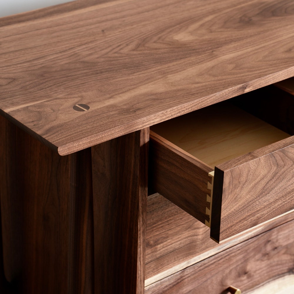 This dresser is made from all solid wood, including the drawers and built using several forms of exposed joinery and hand shaping. I would put this piece closer to a form of art than pure function. The exposed dovetail case, exposed through tenons on the top, the exposed box joints on the drawers, and the extensive shaping of the legs makes this a subtle but fascinating piece. Our only goal at Beauty and Bread Woodshop is to design useful pieces of furniture that are undeniably interesting and with this piece I believe we have achieved what we set out to do.