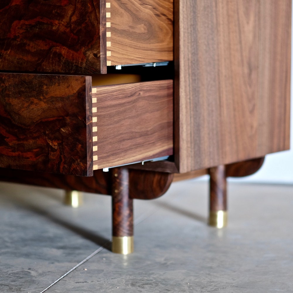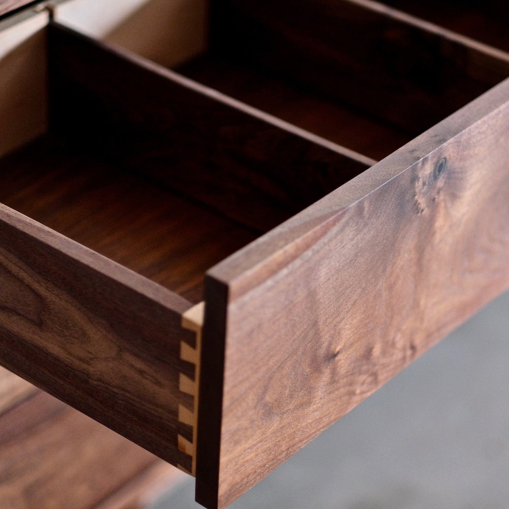 This dresser is made from all solid wood including the drawer and the solid wood drawer dividers. The example shown here is solid walnut with AAA graded figured fronts. The dresser can be made in any domestic hardwood. The Drawers are solid wood and box jointed with contrasting wood to make even the mundane task of opening a drawer a least a little interesting 🙂 The drawers run on Blum soft close slides.