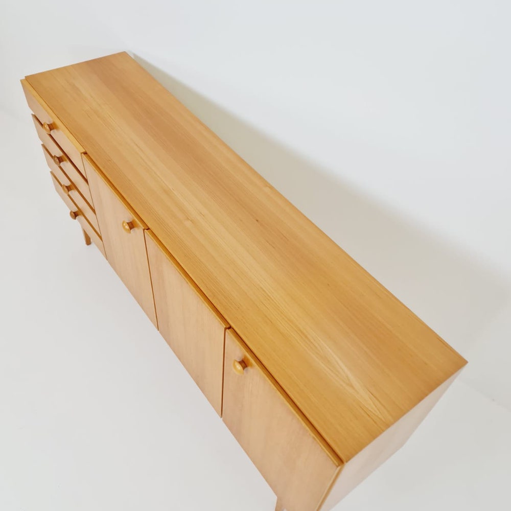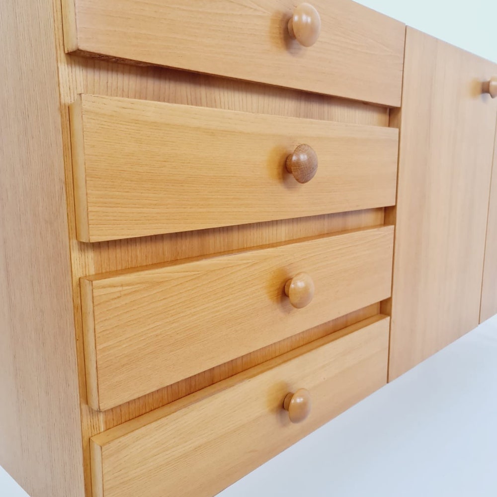 Mid Century Modern German oak Sideboard by GE-EL Möbel, 1960s Made in Germany by GE-EL Möbel Design year: 1960s Dimensions: 43 D x 175 W x 83 H cm It is in good vintage condition, however, as with all vintage items some minor wear marks should be expected. Please inquiry for prices to your country […]