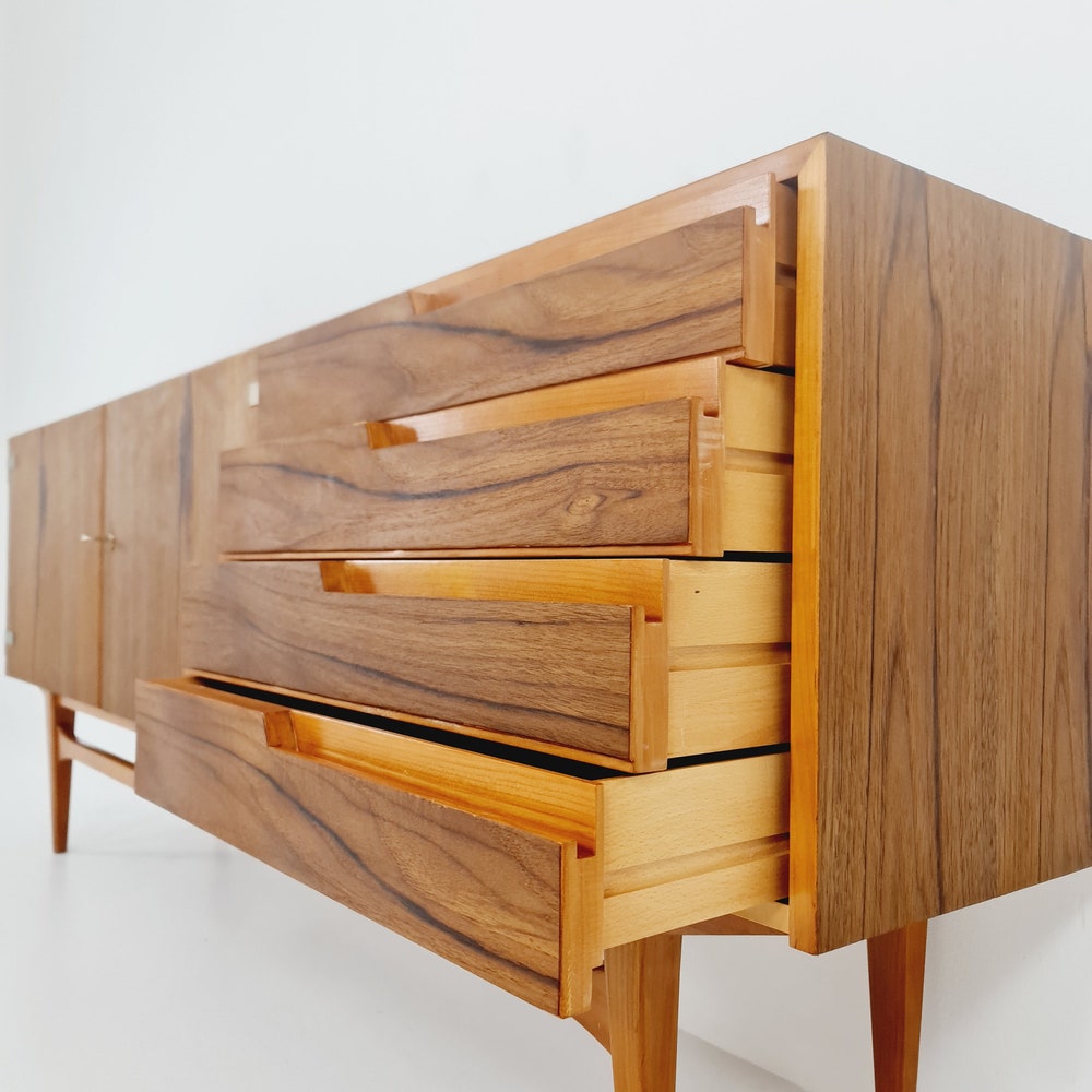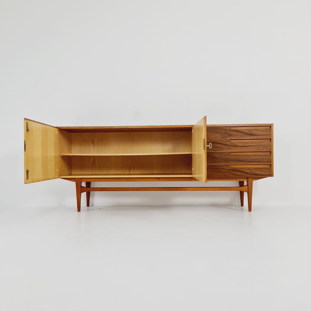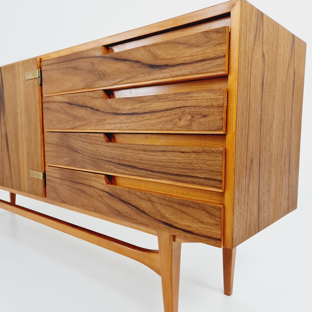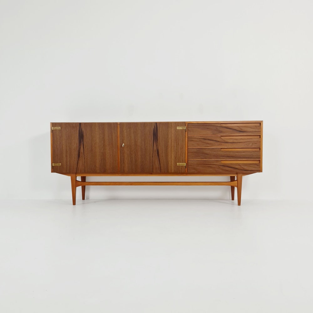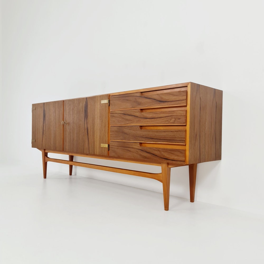 Mid Century Modern German Rare sideboard teak, elm & brass by D. Waldmann, 1960s