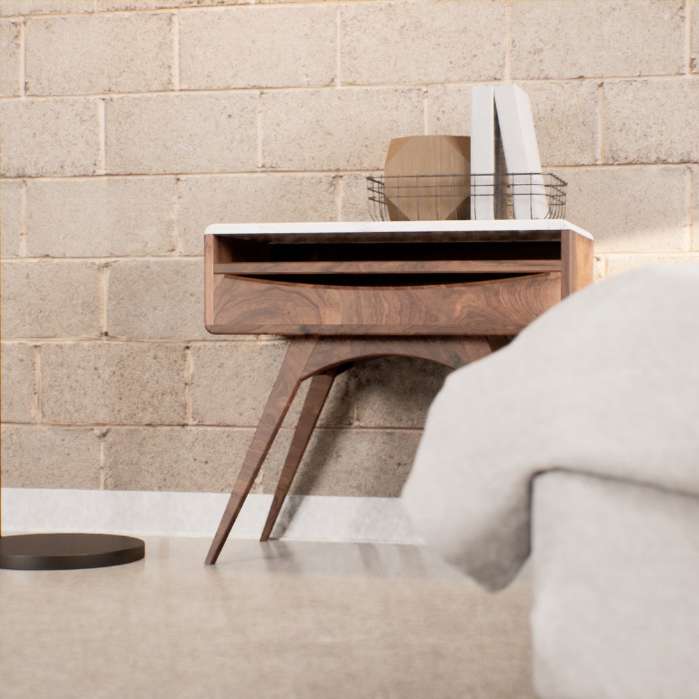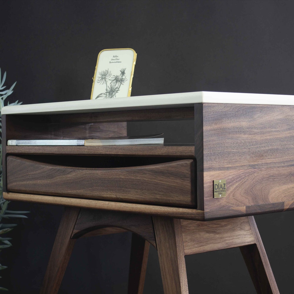 DESCRIPTION——————————————-Bedside table with compass legs and one drawer.Made of solid Chestnut, Teak, or Walnut wood.The tabletop can be made of wood or marble. If you choose marble, I will send you photographs of the available marble options from my local marble workshop during the halfway point of its production, so you can make your choice. […]