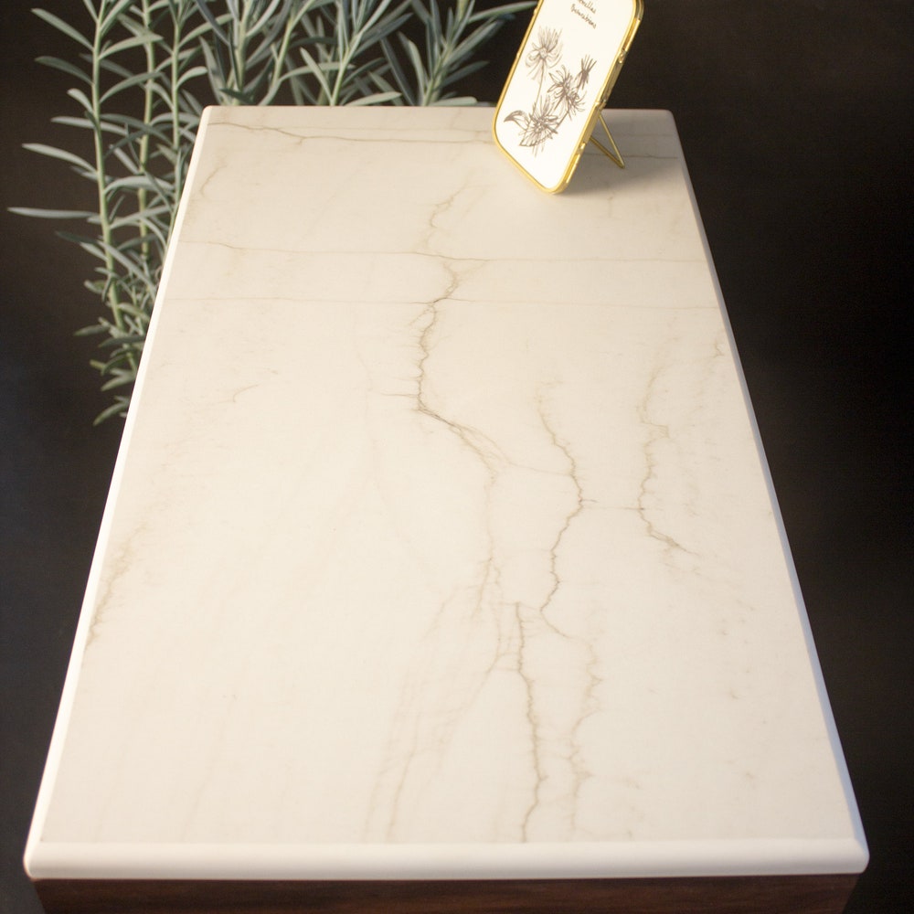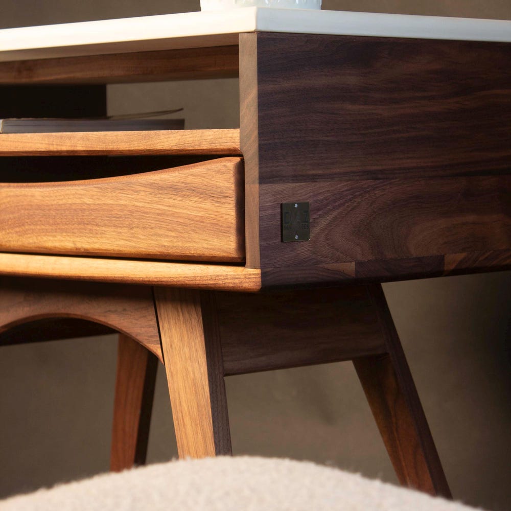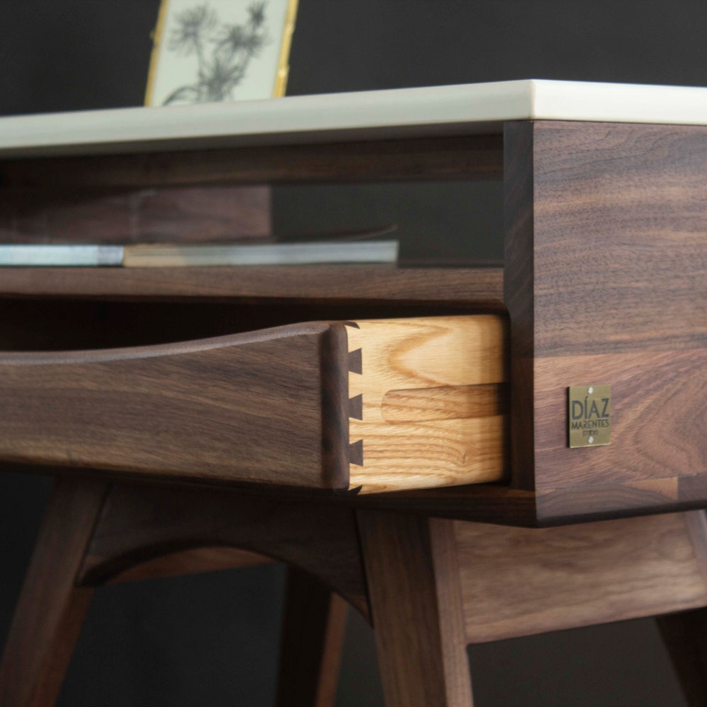 The tabletop can be made of wood or marble. If you choose marble, I will send you photographs of the available marble options from my local marble workshop during the halfway point of its production, so you can make your choice.