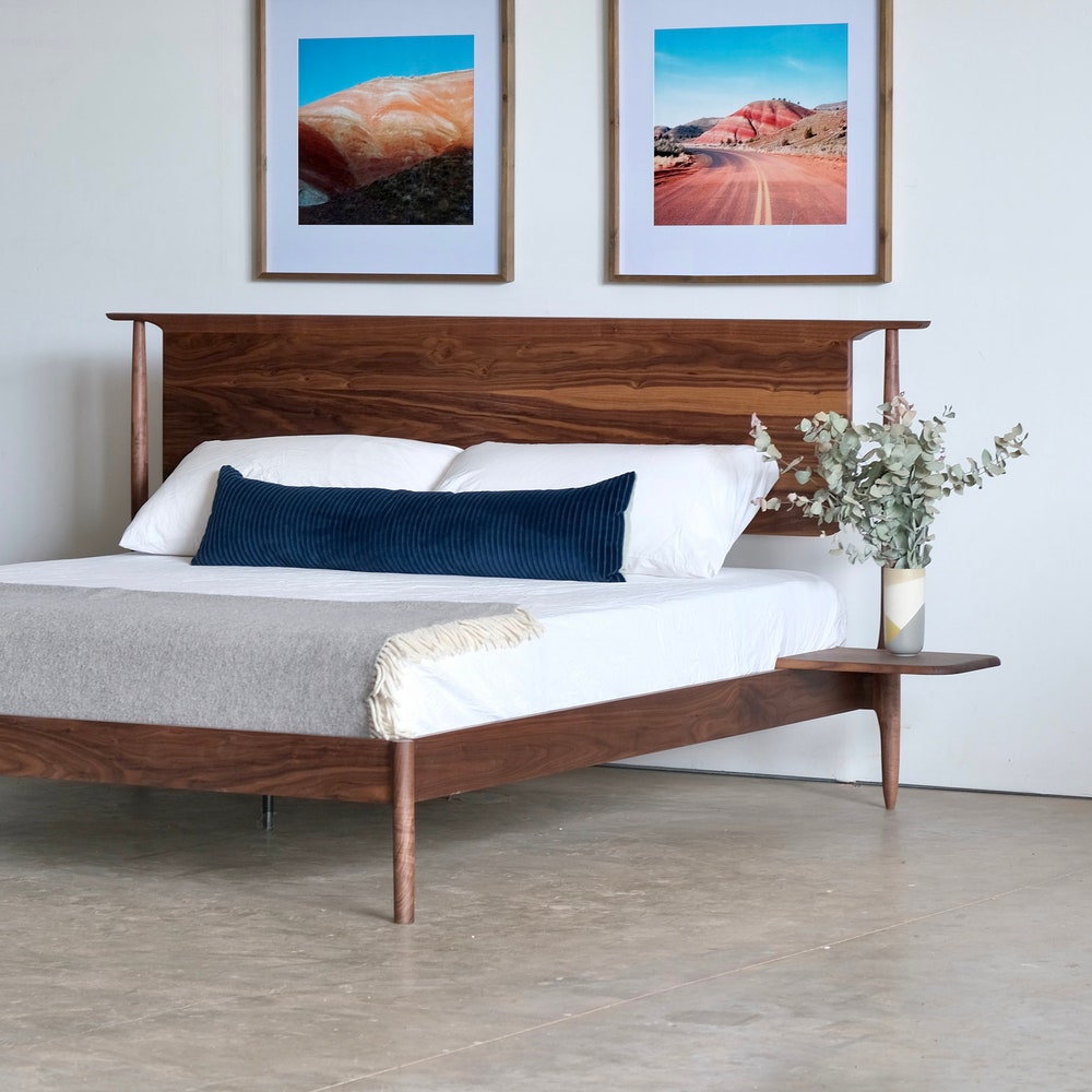 This bed is made from all solid hardwoods using traditional joinery. Once the mattress is on the bed, the headboard has a floating look, covering the three supports from the headboard to the bed frame that give incredible strength and rigidity. All joints are hand sculpted to blend together.