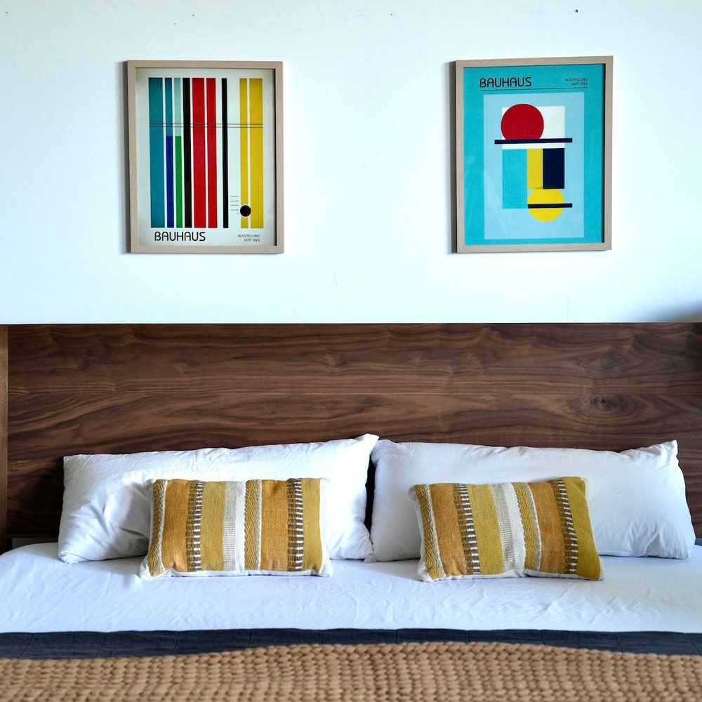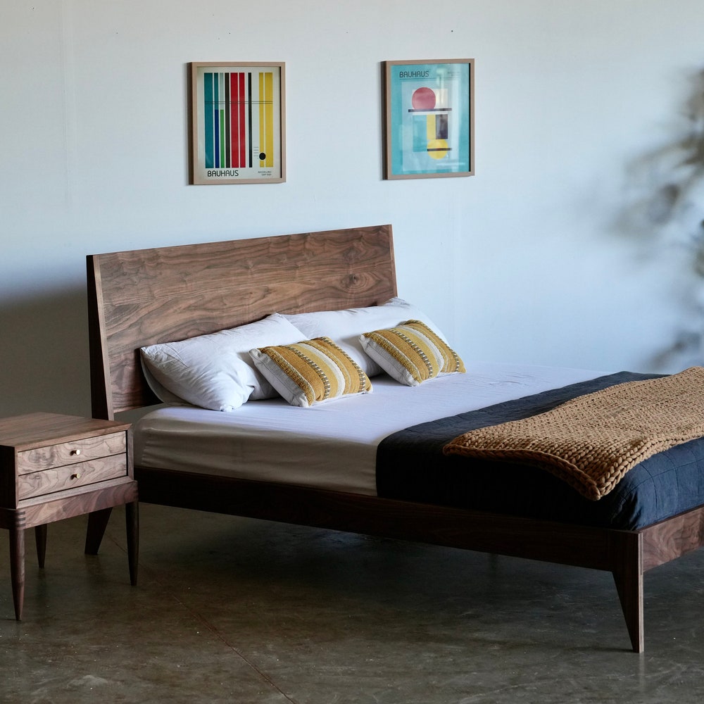 This bed exhibits clean, coherent lines with angles reminiscent of the mid century era, but brought into a contemporary and modern design. The details include exposed angled bridle joints and feet that are subtle, yet instantly eye-catching. The entire bed is constructed with mortise and tenon joinery (super strong) and is finished with a hand rubbed oil/wax to keep a close to wood feel but also protect from a lifetime of use.