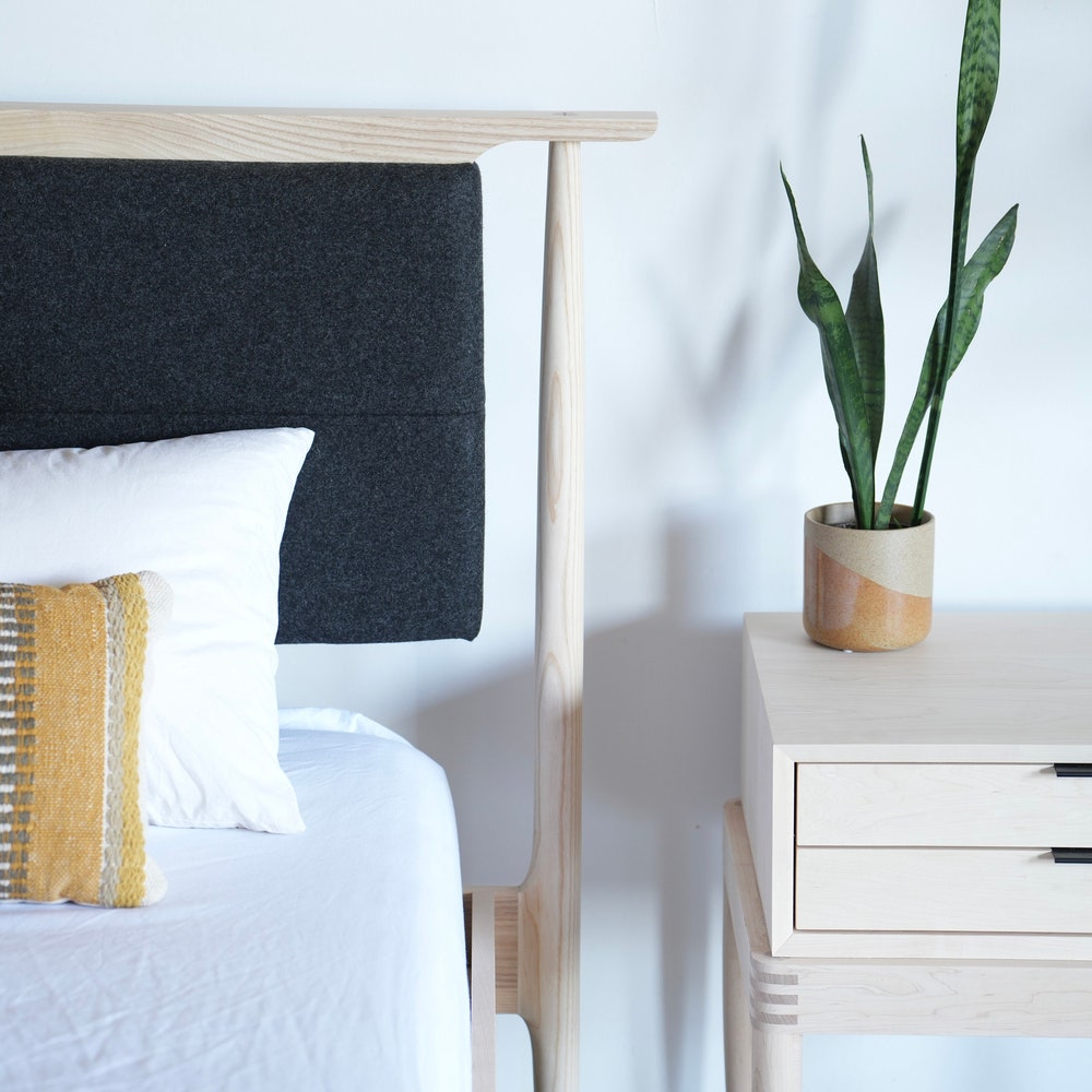Though delicate in design, this bed is remarkably sturdy and stout. The design goal was to have a bed that is both simple in appearance and that gives a strong presence. To have the headboard extend 6″ on either side past the footprint of the rest of the bed frame lends to making a statement in the room without feeling bulky.
