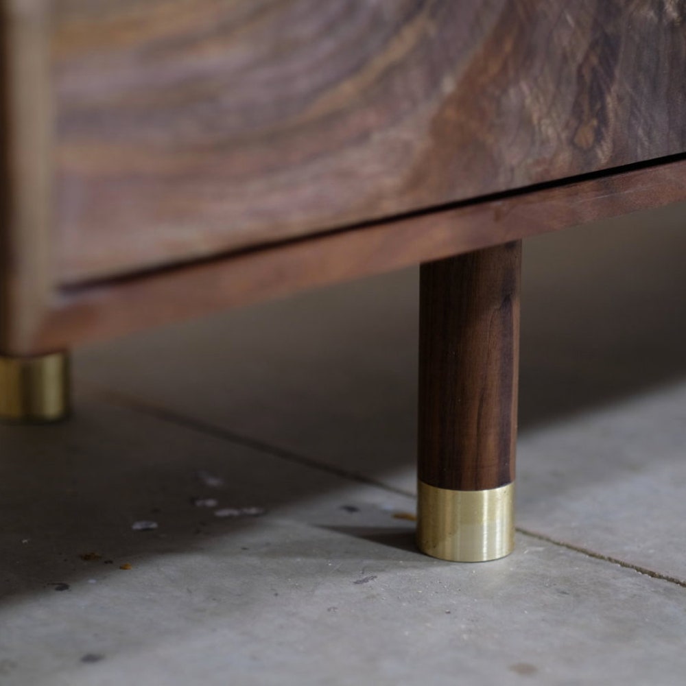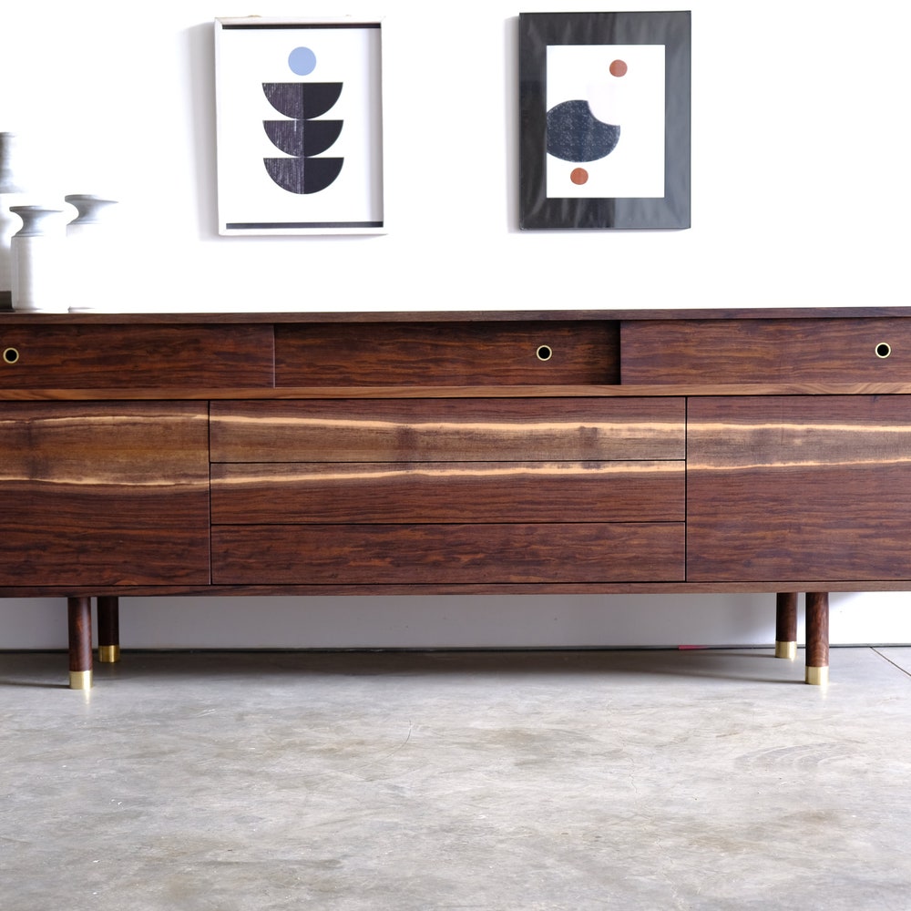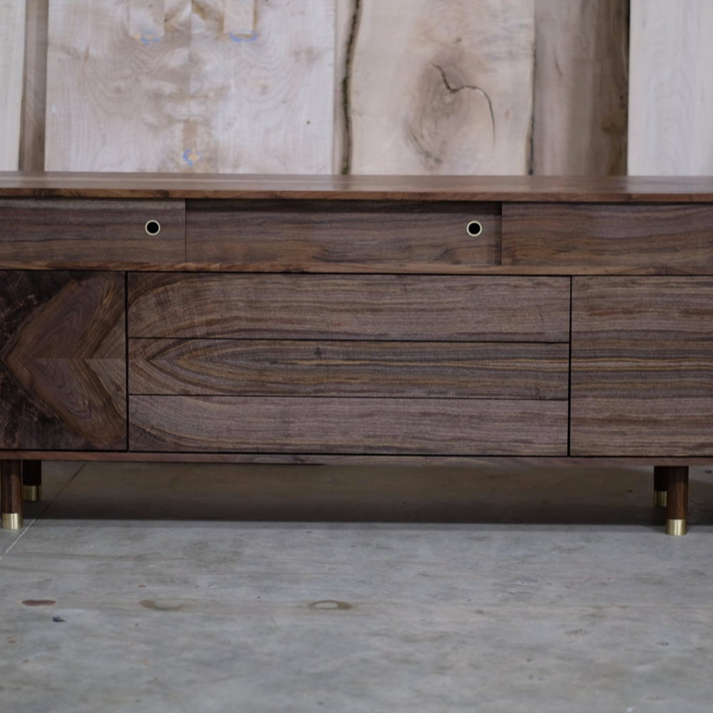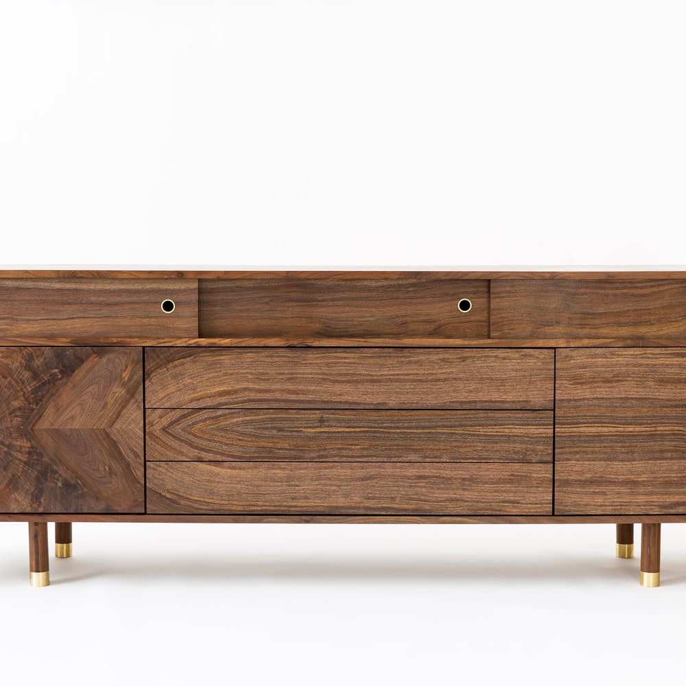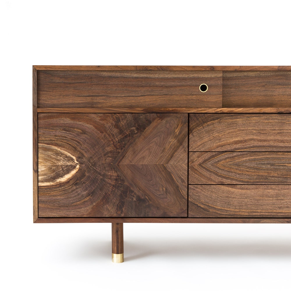 This is a piece that truly speaks for itself. The fully grain matched solid wood walnut facade brings warmth and depth to this otherwise very simple silhouette. The custom made brass feet and drawer pulls on the sliding doors compliment the walnut exquisitely, while adding a subtle softness to the piece.