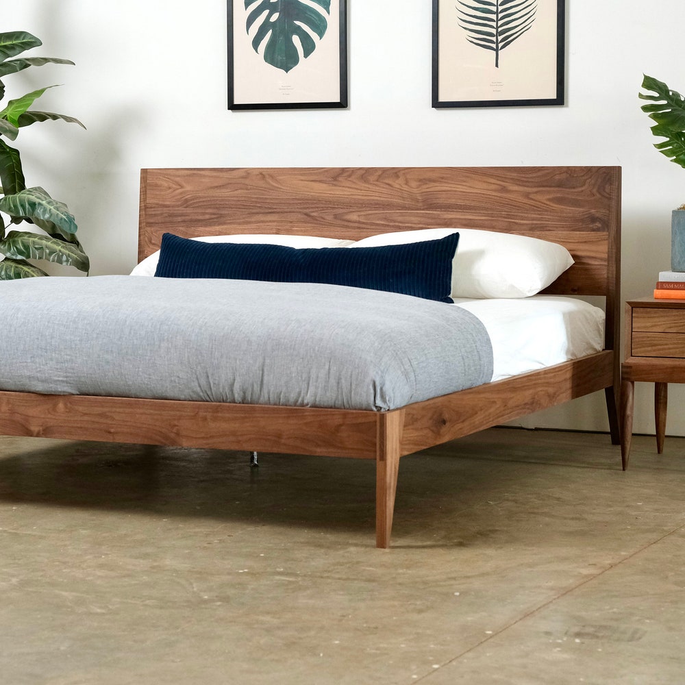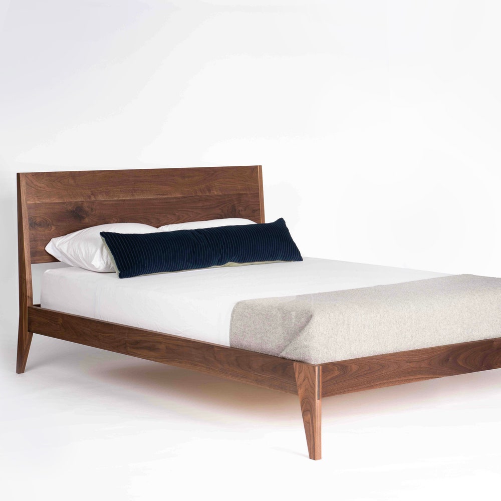 This bed exhibits clean, coherent lines with angles reminiscent of the mid century era, but brought into a contemporary and modern design. The details include exposed angled bridle joints and feet that are subtle, yet instantly eye-catching. The entire bed is constructed with mortise and tenon joinery (super strong) and is finished with a hand rubbed oil/wax to keep a close to wood feel but also protect from a lifetime of use.