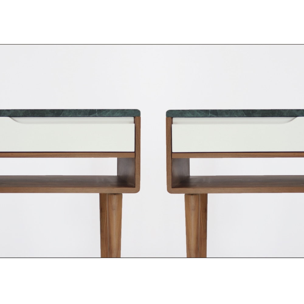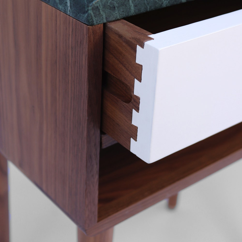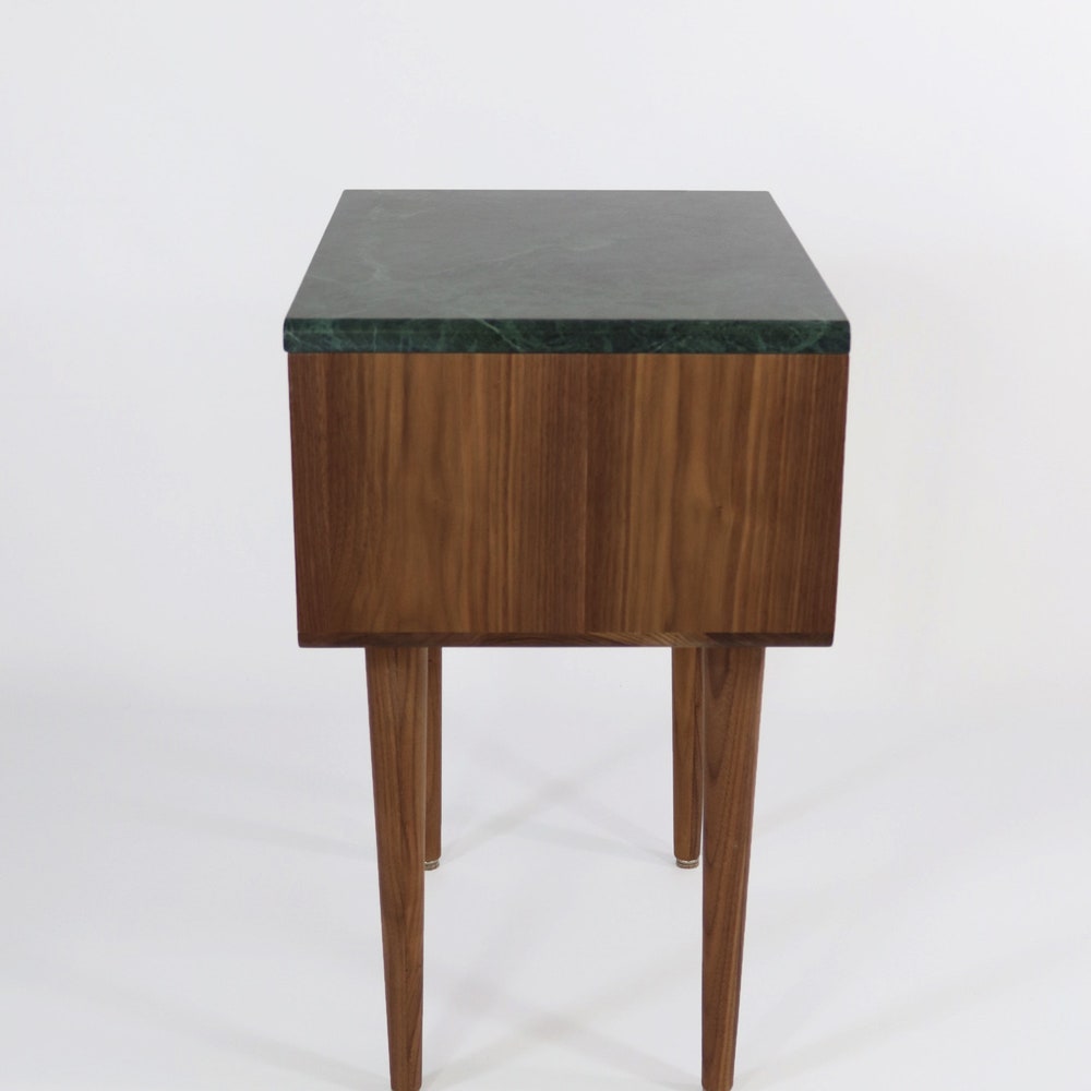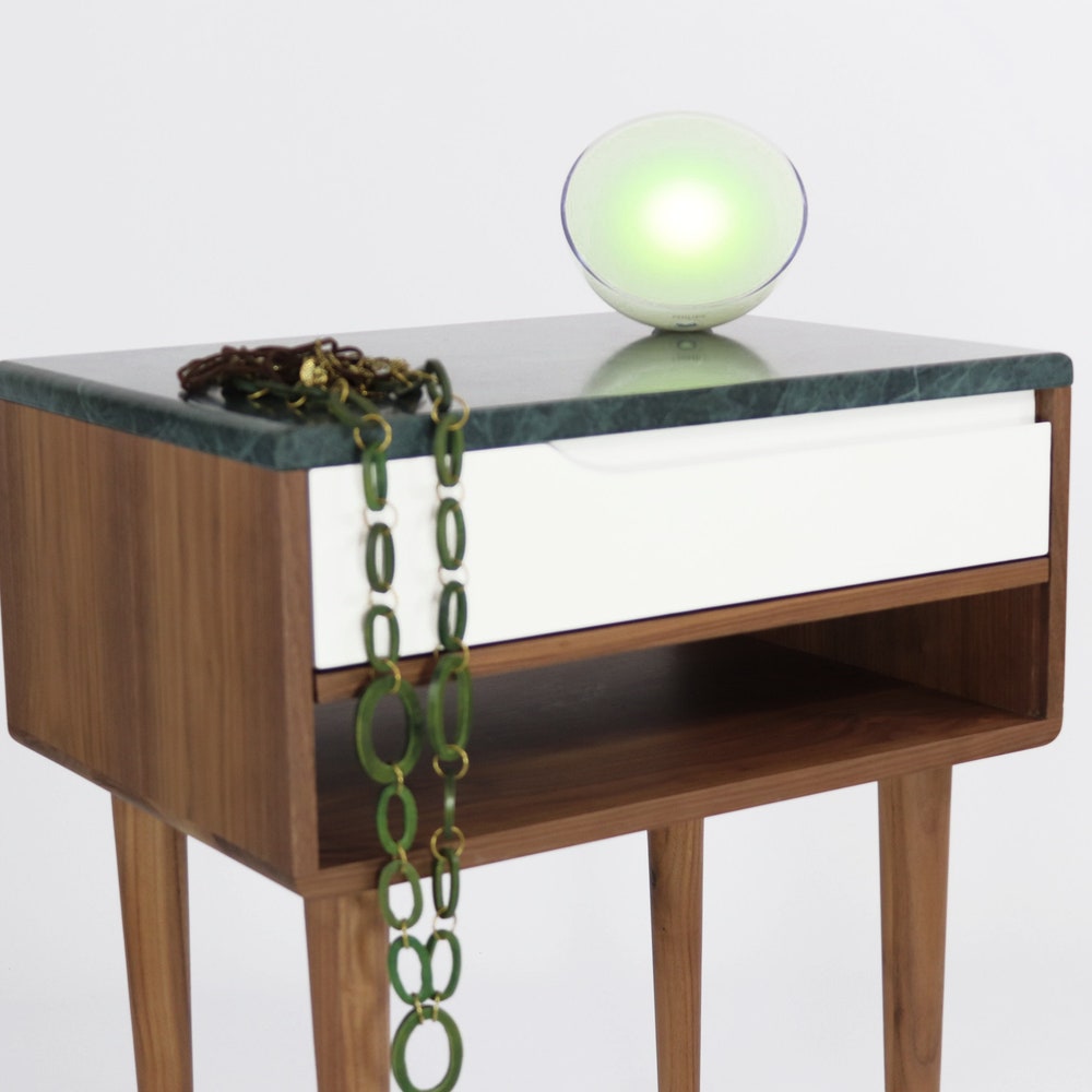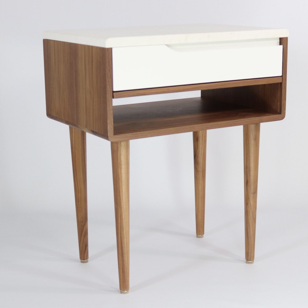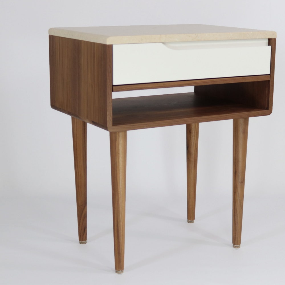 Mid century Nightstand, Bedside table, Side table with marble top, shelf and upper white drawer in solid Walnut.