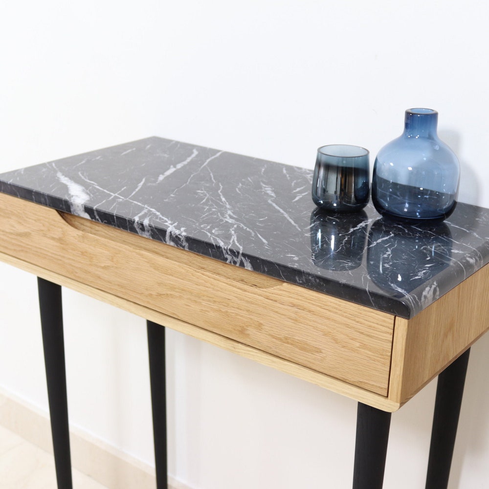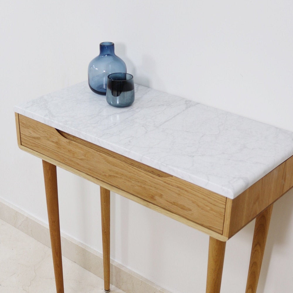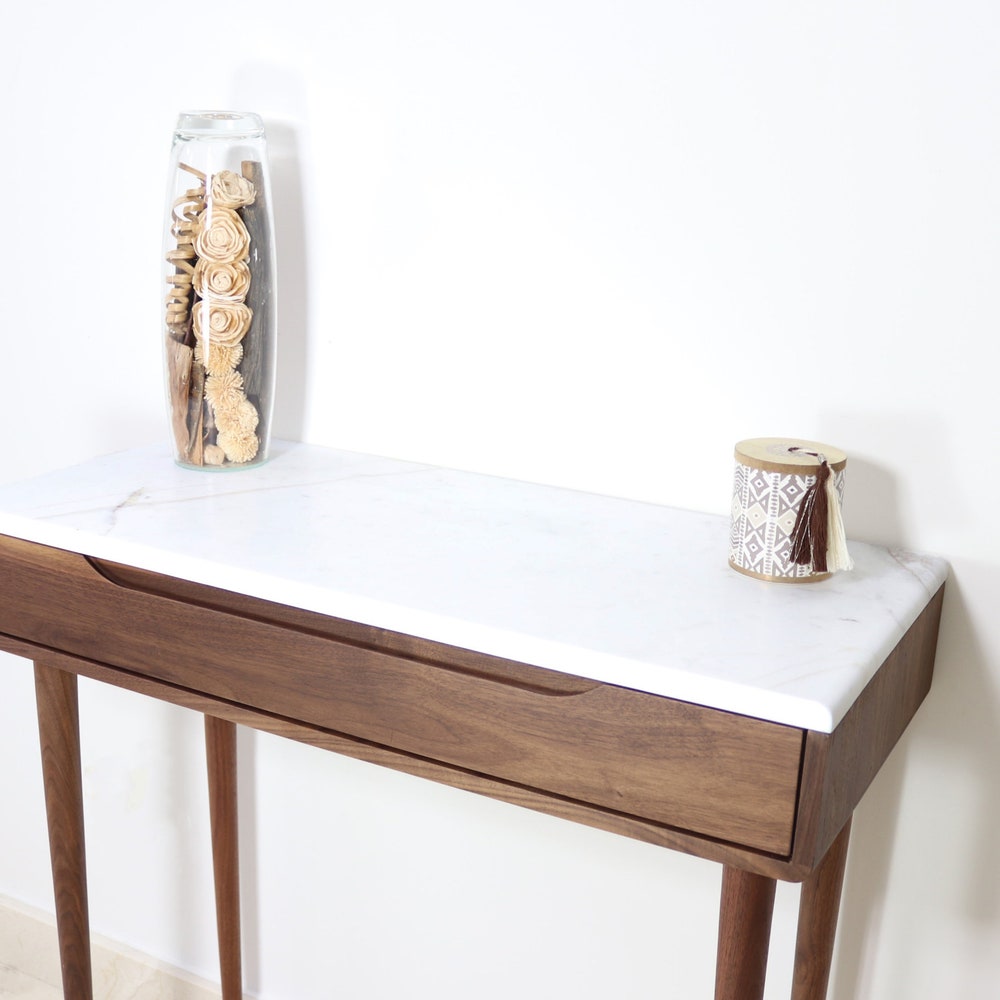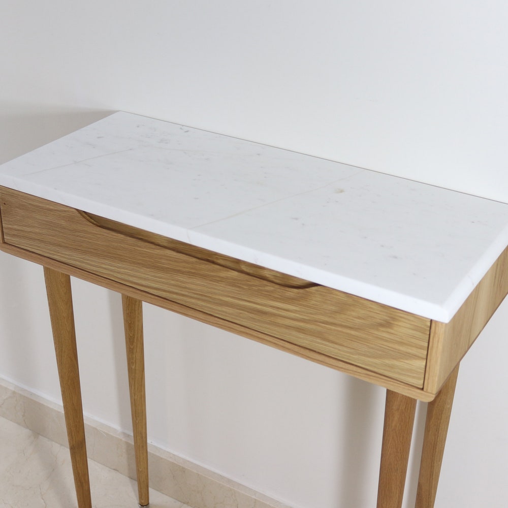 Midcentury console table with 1 drawer and 4 Legs in solid american Oak or Walnut with Marble top