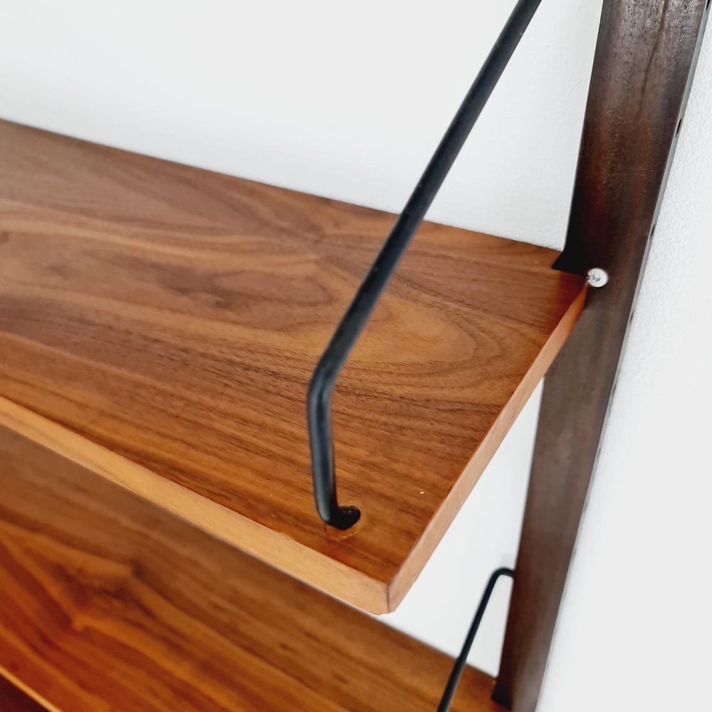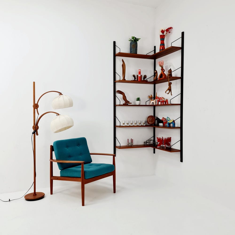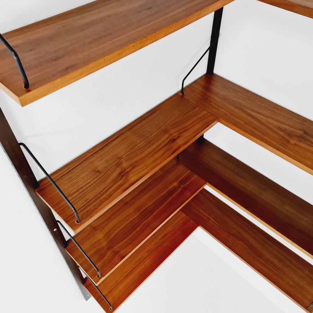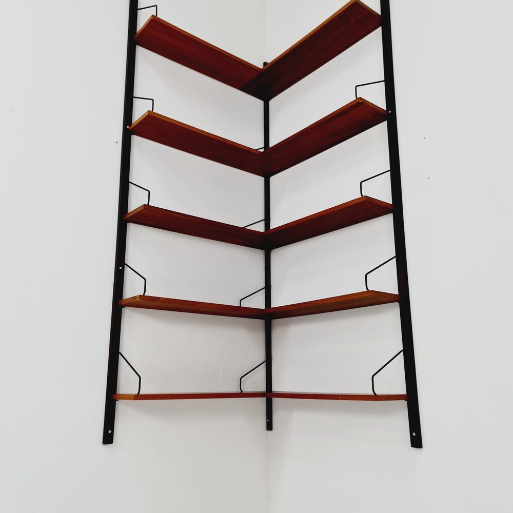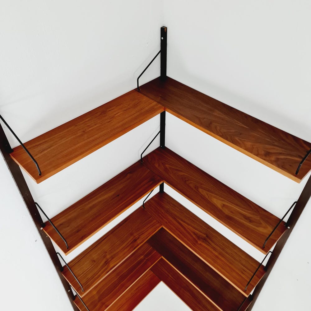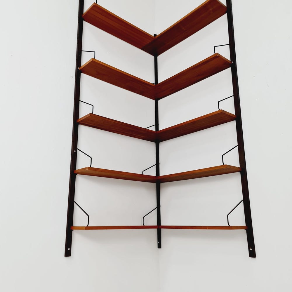 Midcentury Danish walnut Corner Wall-Mounted Shelving Unit, by Royal for Poul Cadovius, 1960s Once the wall mounted brackets are fixed. The brackets have holes in the sides that each shelf support fits into, and you can hang this entire system easily and very quickly. Danish design by Royal for Poul Cadovius Design year: 1960s Dimensions: […]