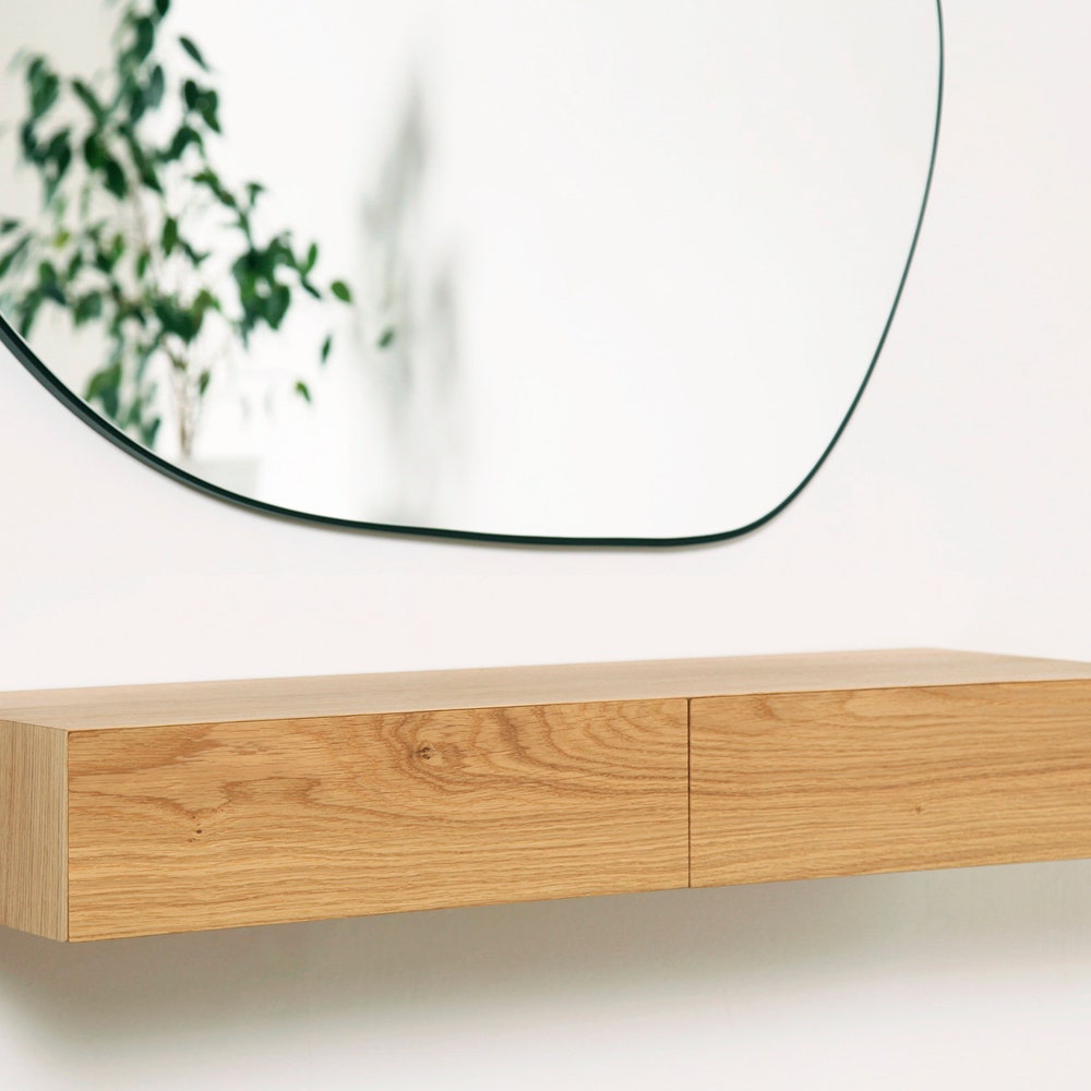 Our floating dressing tables are made with professional joinery, using hand-selected, top-grade oak wood material. We keep an eye on the wood texture: it’s continuous throughout the drawer fronts and accross the top/sides. Once the assembly is ready, we apply a 100% natural-based finish that does not just bring the beatiful wood color and texture to live, but adds a protective coat to offer long-term, carefree usage.