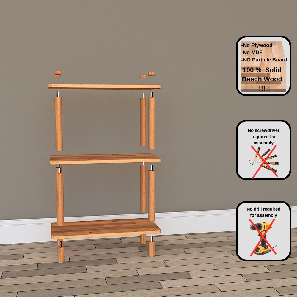 Minimalist Solid Beech Wood Short Bookcase with 3 Shelves, Custom Solid Wooden Wall Bookshelf Unit for Living Room, Entryway Short Bookcase