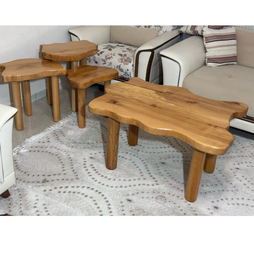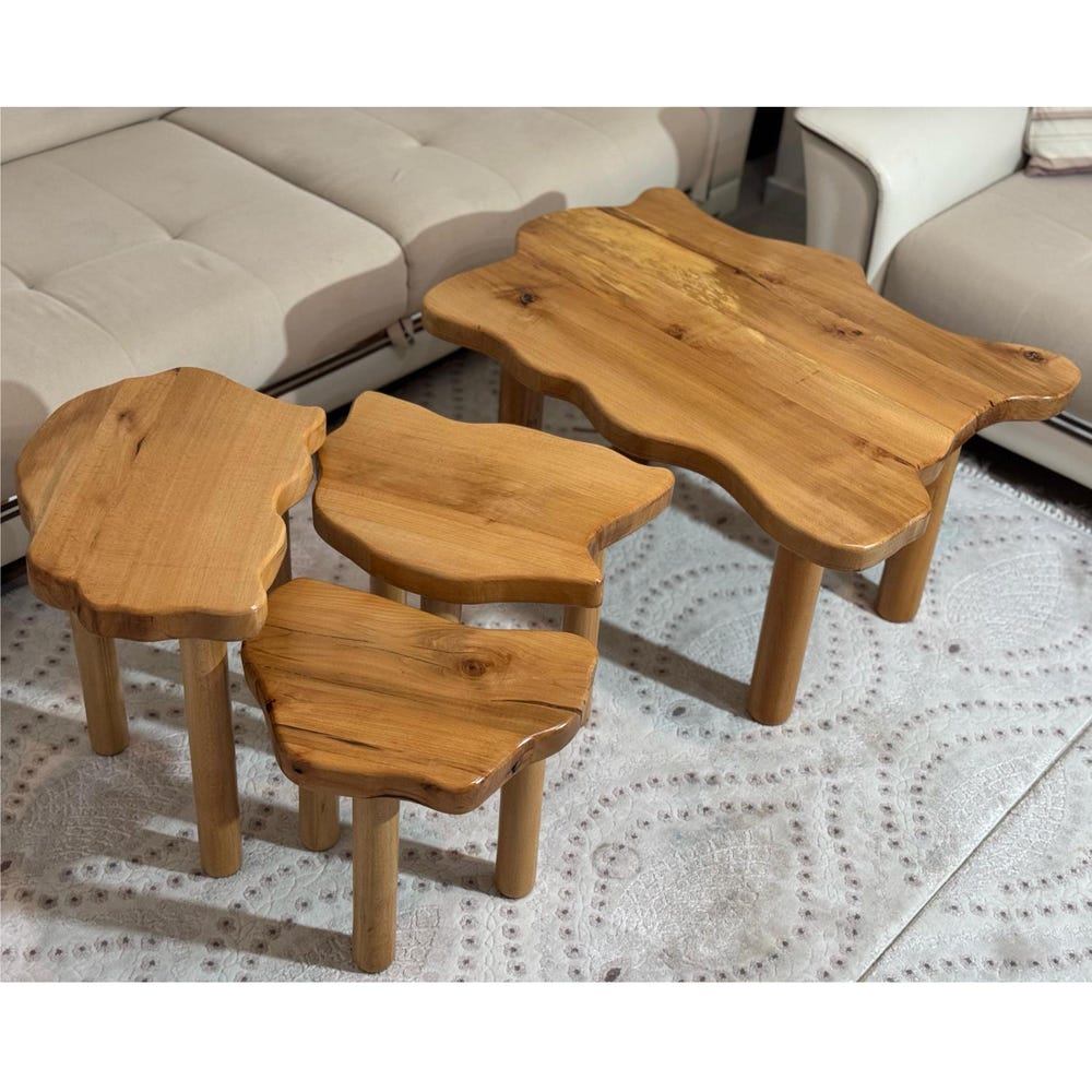 This beautiful set of 4 minimalist nesting tables is handmade from a perfect blend of walnut and beech wood. Ideal for those seeking modern, natural wood furniture with an eco-friendly touch, these tables are perfect for adding style to your living room. The set includes 3 nesting side tables and 1 center coffee table, offering both form and function to your home décor.